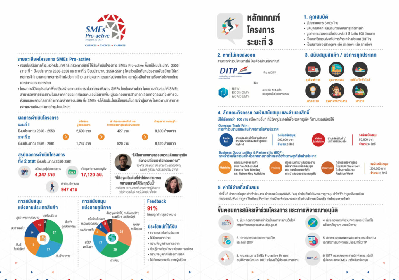 ที่ปรึกษารัฐมนตรีว่าการกระทรวงพาณิชย์ กล่าวว่า กิจกรรมที่จะสนับสนุนครอบคลุมทั้งการเข้าร่วมงานแสดงสินค้า บริการในต่างประเทศ (Overseas Trade Fair) กิจกรรมสร้างโอกาสทางการค้าและเครือข่ายทางธุรกิจในต่างประเทศ (Business Opportunities & Partnership : BOP) และงานแสดงสินค้า บริการเสมือนจริงในต่างประเทศ (Virtual Exhibition) โดยประเภทสินค้าที่ได้รับการอนุมัติมากที่สุด 3 อันดับแรก ได้แก่ สินค้าไลฟ์สไตล์ สินค้าอุตสาหกรรม และสินค้าอาหาร โดยเป็นกิจกรรมในประเทศแถบภูมิภาคอาเซียนมากที่สุด รองลงมาเป็นประเทศแถบภูมิภาคเอเชียตะวันออก