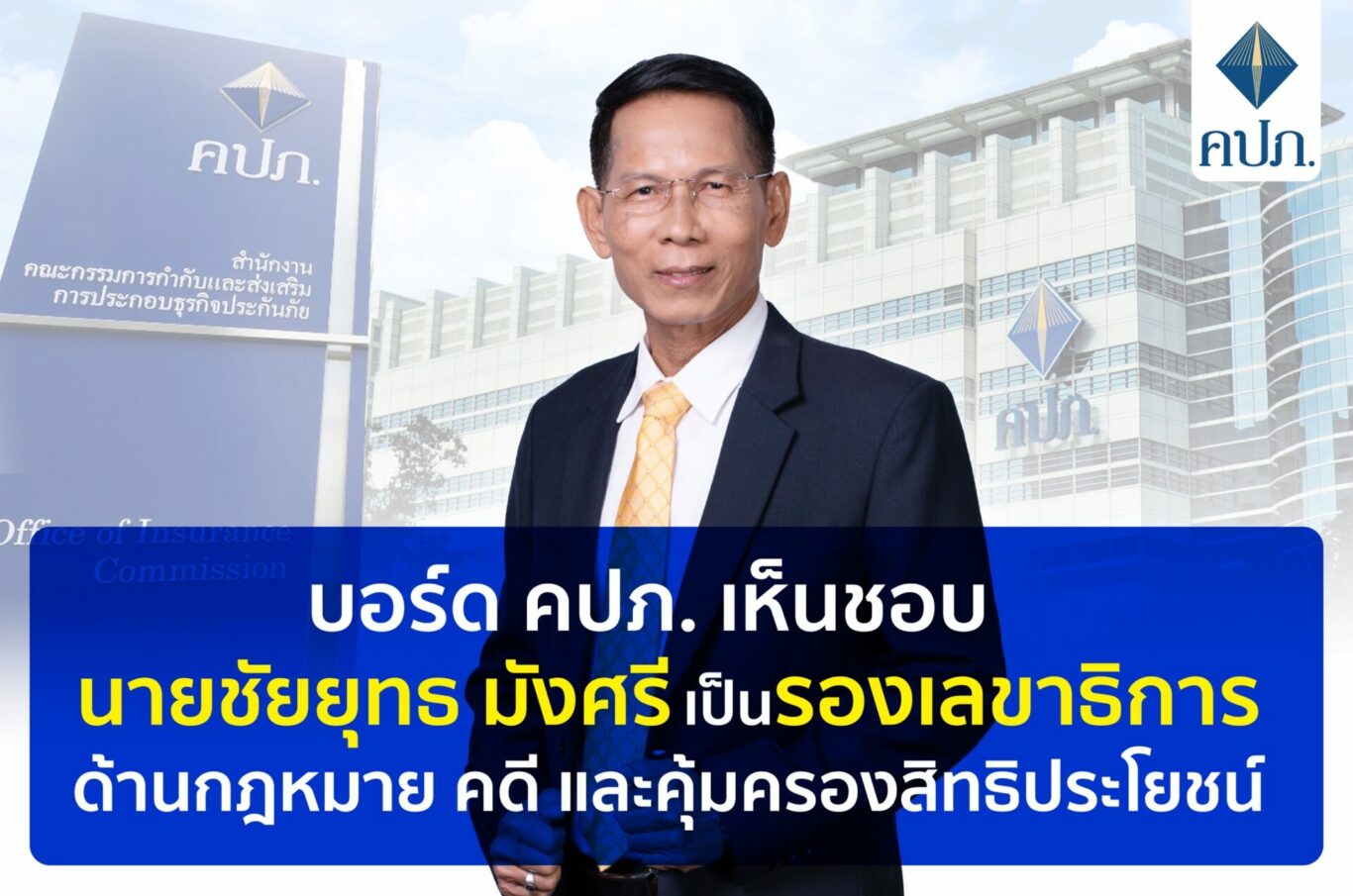 ในการประชุมคณะกรรมการกำกับและส่งเสริมการประกอบธุรกิจประกันภัย ครั้งที่ 15/2564 เมื่อวันที่ 24 ธันวาคม 2564 คณะกรรมการ คปภ. มีมติเห็นชอบตามที่สำนักงาน คปภ. เสนอให้ นายชัยยุทธ มังศรี ดำรงตำแหน่ง รองเลขาธิการ ด้านกฎหมาย คดี และคุ้มครองสิทธิประโยชน์ เพื่อทดแทนตำแหน่งเดิมที่ว่างลง โดยมีคำสั่งแต่งตั้งเมื่อวันที่ 24 ธันวาคม 2564