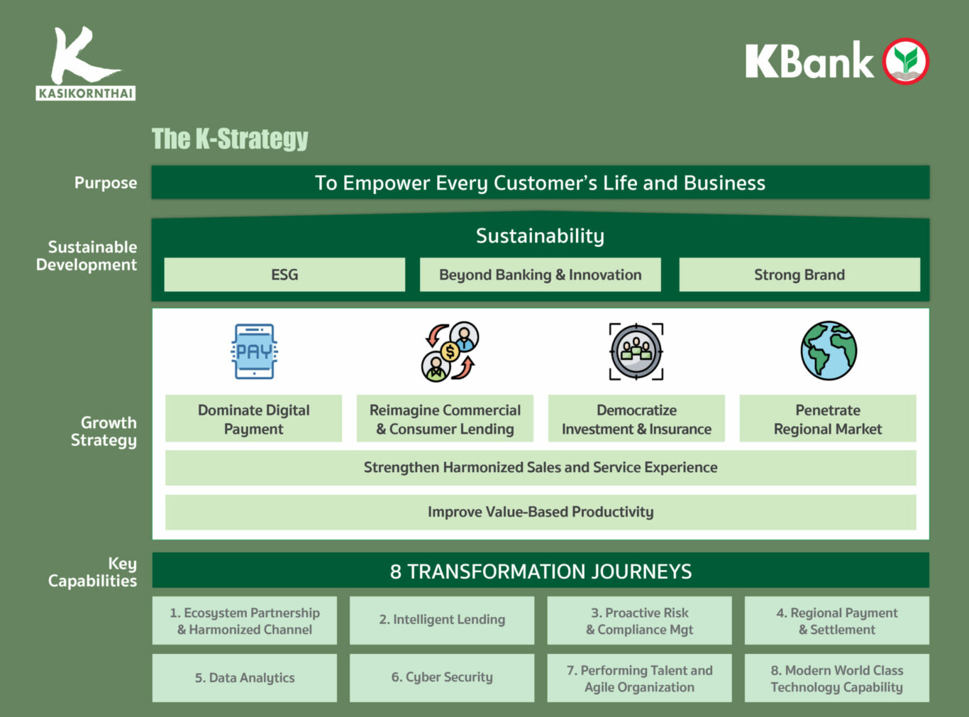 โดยธนาคารกสิกรไทยกำหนดยุทธศาสตร์เพื่อการเติบโตทางธุรกิจและตอบโจทย์ลูกค้าอย่างต่อเนื่อง ดังนี้