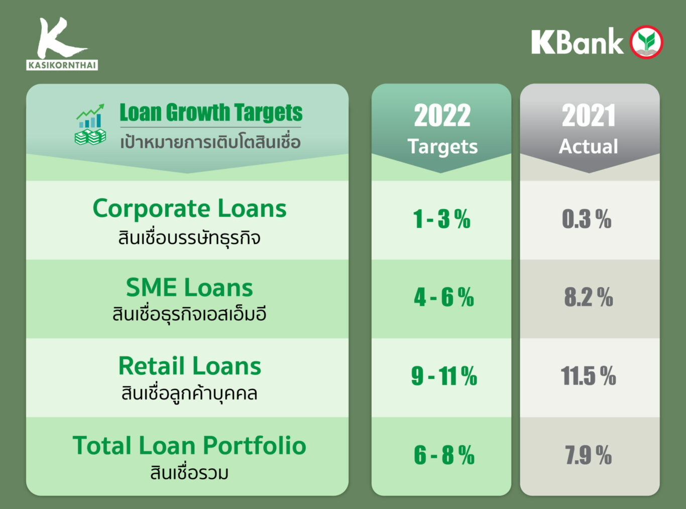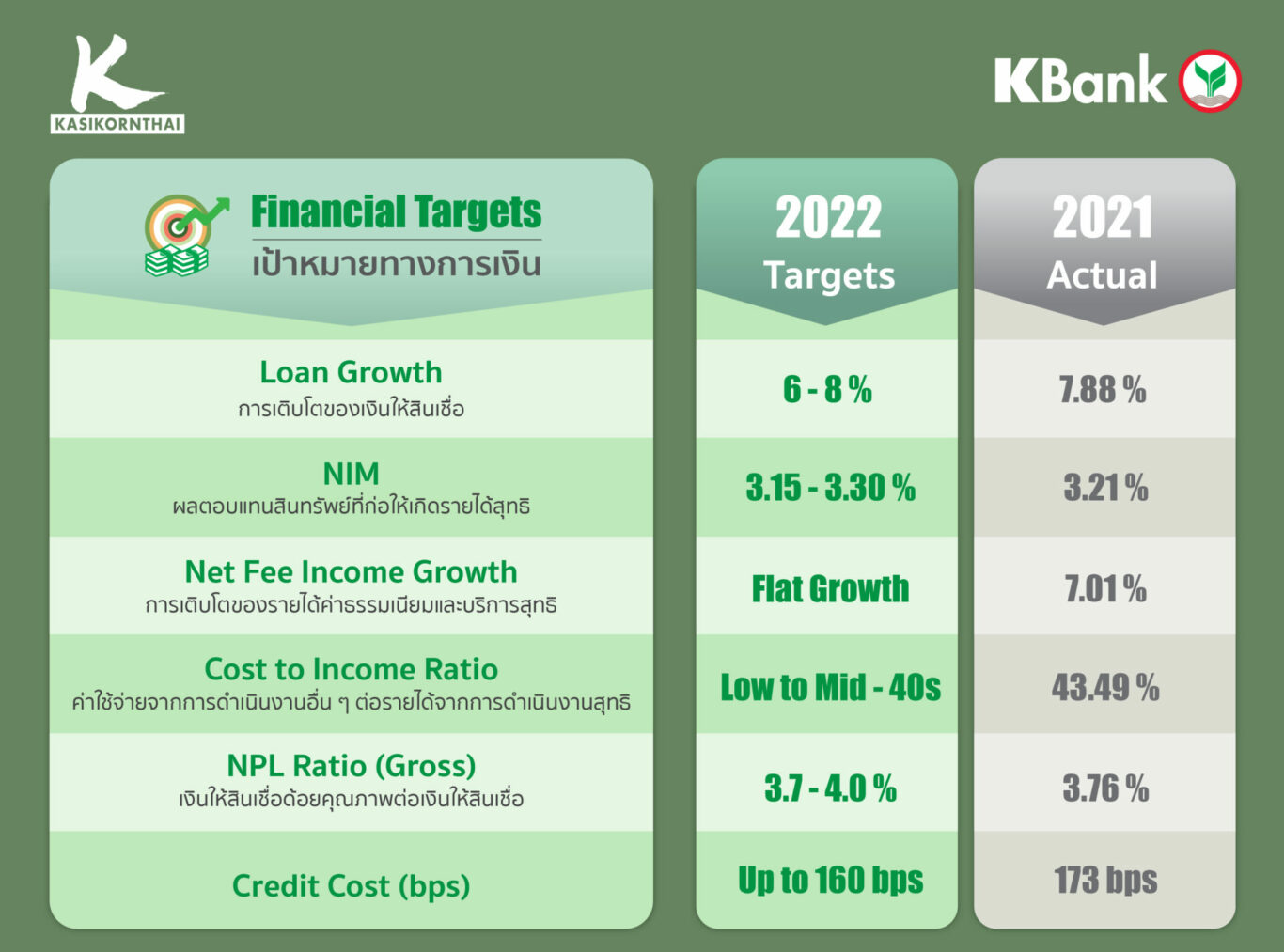 ภายใต้ทิศทางเศรษฐกิจและปัจจัยความท้าทายดังกล่าว ธนาคารกสิกรไทยได้ประกาศเป้าหมายทางการเงินปี 2565 ดังนี้