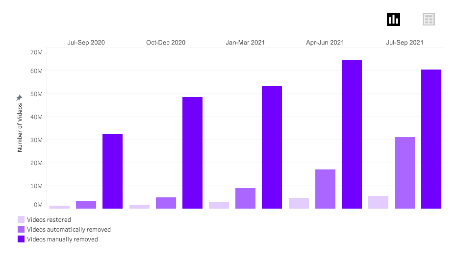 ของปีที่ผ่านมาเล็กน้อย - วิดีโอที่ถูกคัดกรองและนำออกอัตโนมัติโดยเทคโนโลยีตรวจจับ มีจำนวนมากกว่า 30 ล้านคลิป เพิ่มขึ้นเกือบเท่าตัวจากไตรมาสที่ 2 ของปี แสดงถึงประสิทธิภาพการตรวจจับและคัดกรองของระบบที่เข้มงวดมากขึ้น