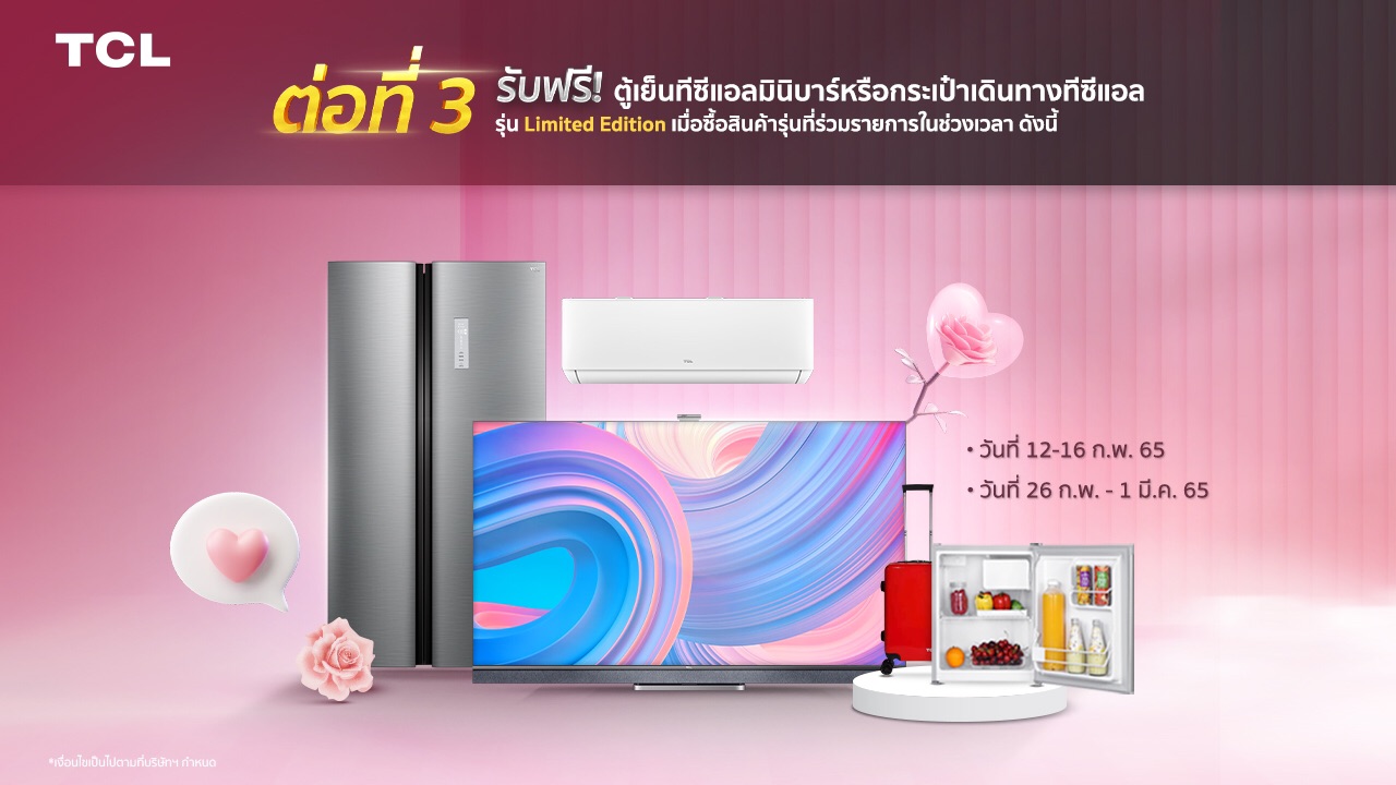 สำหรับลูกค้าที่มีแผนจะซื้อผลิตภัณฑ์เครื่องใช้ไฟฟ้าแบรนด์ทีซีแอลเพื่อมอบเป็นของขวัญในช่วงเทศกาลวาเลนไทน์ หรือในเดือนแห่งความรักนี้ สามารถเข้าร่วมแคมเปญเที่ยวไทยเที่ยวฟรีกับทีซีแอล เพียงลูกค้าที่ซื้อผลิตภัณฑ์แบรนด์ทีซีแอลที่ร่วมรายการกว่า 76 รุ่น ในช่วงระยะเวลาตั้งแต่วันนี้ – 17 มีนาคม 65 จะได้สิทธิ์ลุ้นรับของรางวัลถึง 3 ต่อ