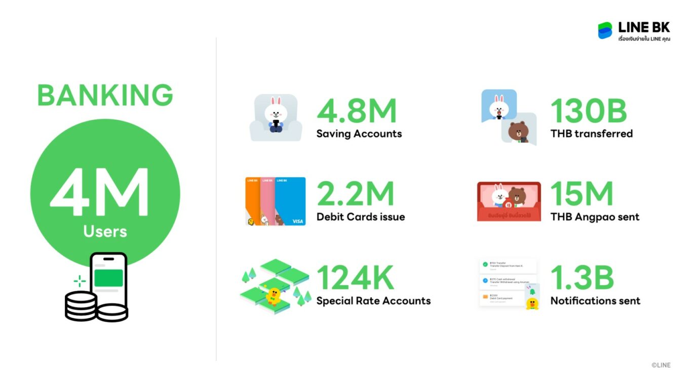 สำหรับบริการสินเชื่อ LINE BK ขณะนี้มีอยู่ 2 ประเภท คือ วงเงินให้ยืม (Credit Line) สินเชื่อส่วนบุคคล และวงเงินให้ยืมนาโน (Nano Credit Line) สินเชื่อรายย่อยเพื่อการประกอบอาชีพ ซึ่งได้รับความสนใจเป็นจำนวนมาก โดยมีการปล่อยสินเชื่อไปแล้วกว่า 5 แสนบัญชี ด้วยยอดรวมสินเชื่อกว่า 3 หมื่นล้านบาท ในช่วงเวลาที่ผ่านมา สัดส่วนเกือบครึ่งหนึ่งของลูกค้า LINE BK เป็นผู้มีอาชีพอิสระ และอยู่ในพื้นที่ต่างจังหวัดเกือบ 80% ซึ่งในปี 2565 LINE BK ยังคงตั้งใจเป็นส่วนหนึ่งในการช่วยเหลือกลุ่มคนที่ไม่มีรายได้ประจำเป็นผู้ประกอบอาชีพอิสระที่ต้องการเข้าแหล่งเงินที่ถูกต้องตามกฎหมาย โดยวางแผนขยายฐานลูกค้าให้กว้างขึ้นและครอบคลุมทั่วประเทศ ทั้งในพื้นที่กรุงเทพฯ ปริมณฑล และต่างจังหวัด โดยบริษัทฯ ได้ตั้งเป้ายอดสินเชื่อคงค้างโตกว่า 20,000 ล้านบาทในสิ้นปีนี้