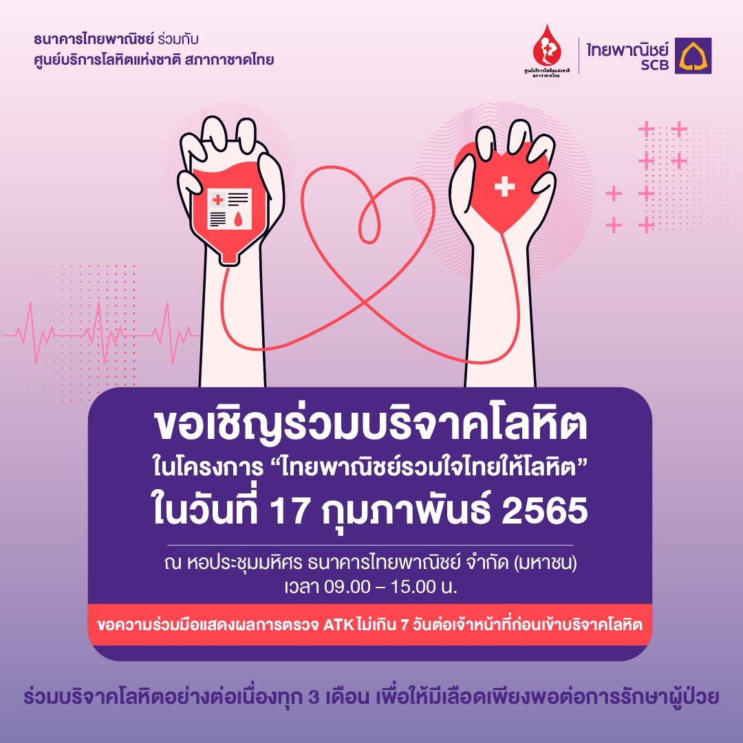 ธนาคารไทยพาณิชย์ ร่วมกับ ศูนย์บริการโลหิตแห่งชาติ สภากาชาดไทย ขอเชิญร่วมบริจาคโลหิต ในเดือนแห่งความรัก ภายใต้โครงการ “ไทยพาณิชย์รวมใจไทยให้โลหิต” ในวันพฤหัสบดีที่ 17 กุมภาพันธ์ 2565 เวลา 9.00-15.00 น. ณ หอประชุมมหิศร ธนาคารไทยพาณิชย์ สำนักงานใหญ่ (รัชโยธิน) เพื่อแสดงออกซึ่งความรักและแบ่งปันต่อเพื่อนมนุษย์ อีกทั้งยังเป็นการเติมเต็มปริมาณโลหิตให้มีเพียงพอต่อการรักษาพยาบาลผู้ป่วยทั่วประเทศ บรรเทาวิกฤติขาดแคลนโลหิตจากสถานการณ์การระบาดของโรคติดเชื้อไวรัสโควิด-19 ทั้งนี้ขอความร่วมมือผู้ที่จะมาบริจาคโลหิตแสดงผลการตรวจ ATK ไม่เกิน 7 วันต่อเจ้าหน้าที่ก่อนเข้าบริจาคโลหิต