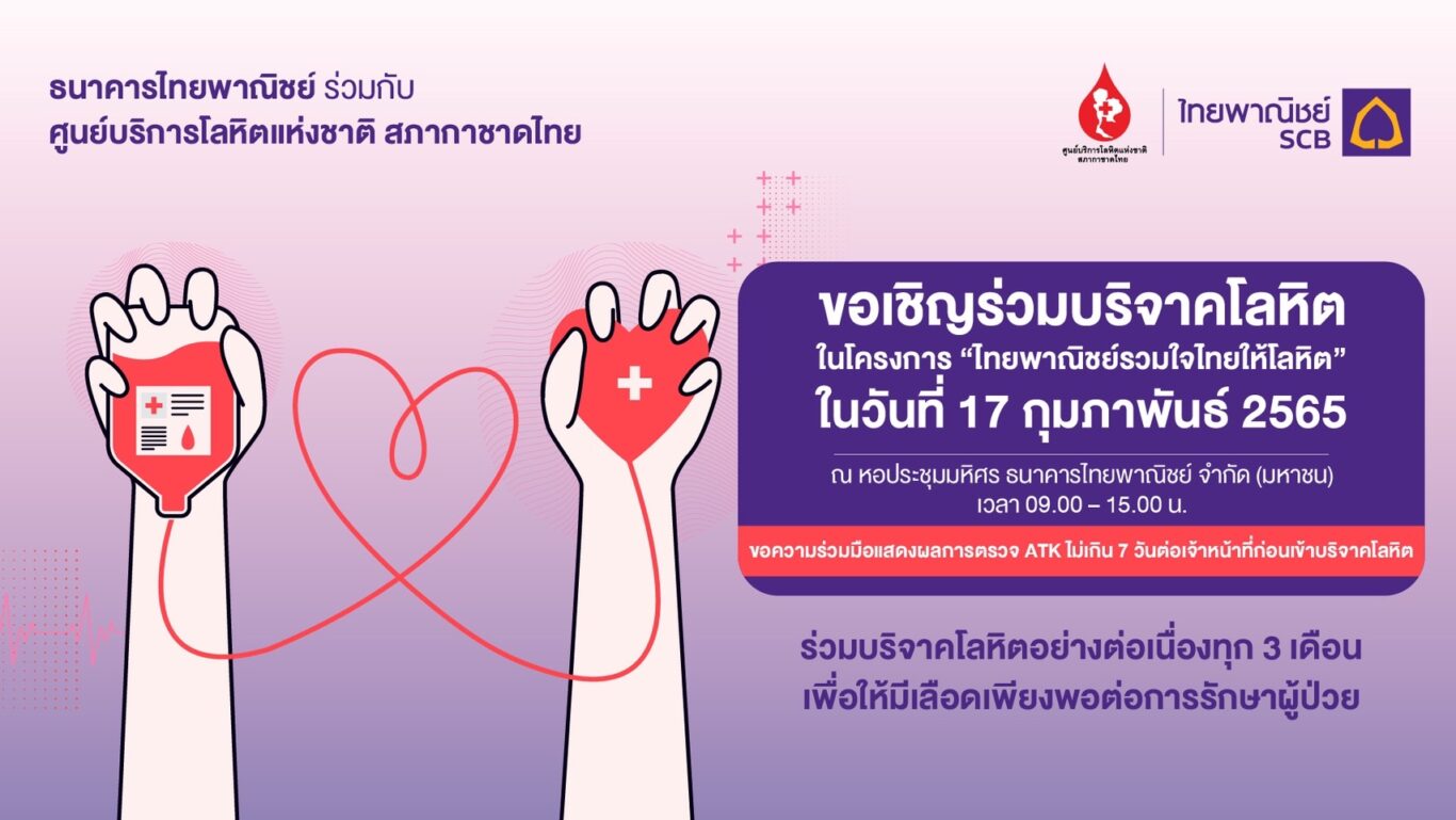 ธนาคารไทยพาณิชย์ ร่วมกับ ศูนย์บริการโลหิตแห่งชาติ สภากาชาดไทย ขอเชิญร่วมบริจาคโลหิต 17 ก.พ. นี้ ที่ธนาคารไทยพาณิชย์ สำนักงานใหญ่