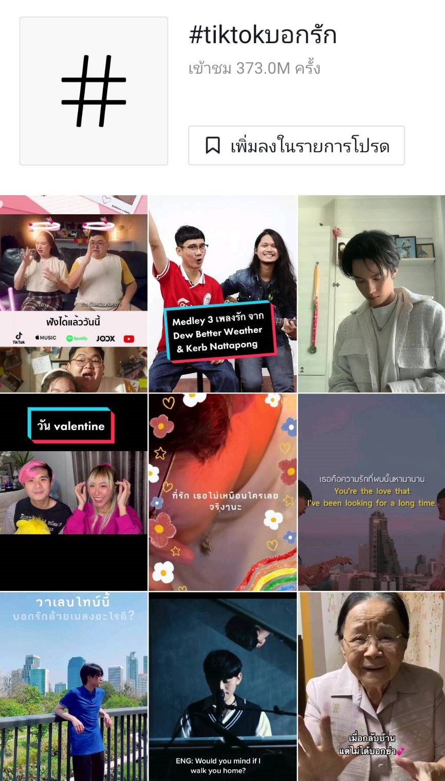 - #TikTokบอกรัก แฮชแท็กสุดฮอตบน TikTok ที่มีผู้ใช้เข้ามาร่วมแชร์คอนเทนต์บอกรักในรูปแบบต่างๆ มากกว่า 20,000 วิดีโอ ไม่ว่าจะเป็น How to บอกรักหลายๆ ภาษา ที่นอกจากจะได้บอกรักกันให้หวานฉ่ำแล้ว ยังได้ความรู้อีกด้วย