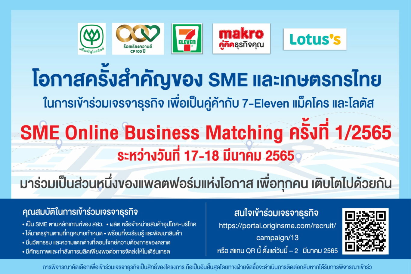 แม็คโคร ยังคงเดินหน้าลุยสร้าง “แพลตฟอร์มแห่งโอกาส” อย่างต่อเนื่อง ล่าสุด ประกาศจัดงานสำคัญ “SME Online Business Matchingครั้งที่ 1” ในวันที่ 17 – 18 มีนาคม 2565 ซึ่งเป็นกิจกรรมเจรจาธุรกิจ ในรูปแบบออนไลน์ครั้งแรกที่สำคัญ เพราะเป็นการผนึกกำลังธุรกิจในเครือซีพี ไม่ว่าจะเป็น แม็คโครLotus’s และ เซเว่น อีเลฟเว่น สร้างโอกาสให้ SME และเกษตรกรไทย เข้าถึงช่องทางการตลาดที่แข็งแกร่งและหลากหลาย ข่าวว่างานนี้มี แอปพลิเคชั่น ที่สร้างสรรค์ขึ้นใหม่เพื่อเป็น “ทางลัด!” ให้ SME และเกษตรกร พร้อมแจงประเภทสินค้าที่ตลาดต้องการให้เป็น “ลายแทง” ครอบคลุมทั้งกลุ่มอาหารสด กลุ่มอาหารแห้ง-เครื่องดื่ม และกลุ่มสินค้าอุปโภค