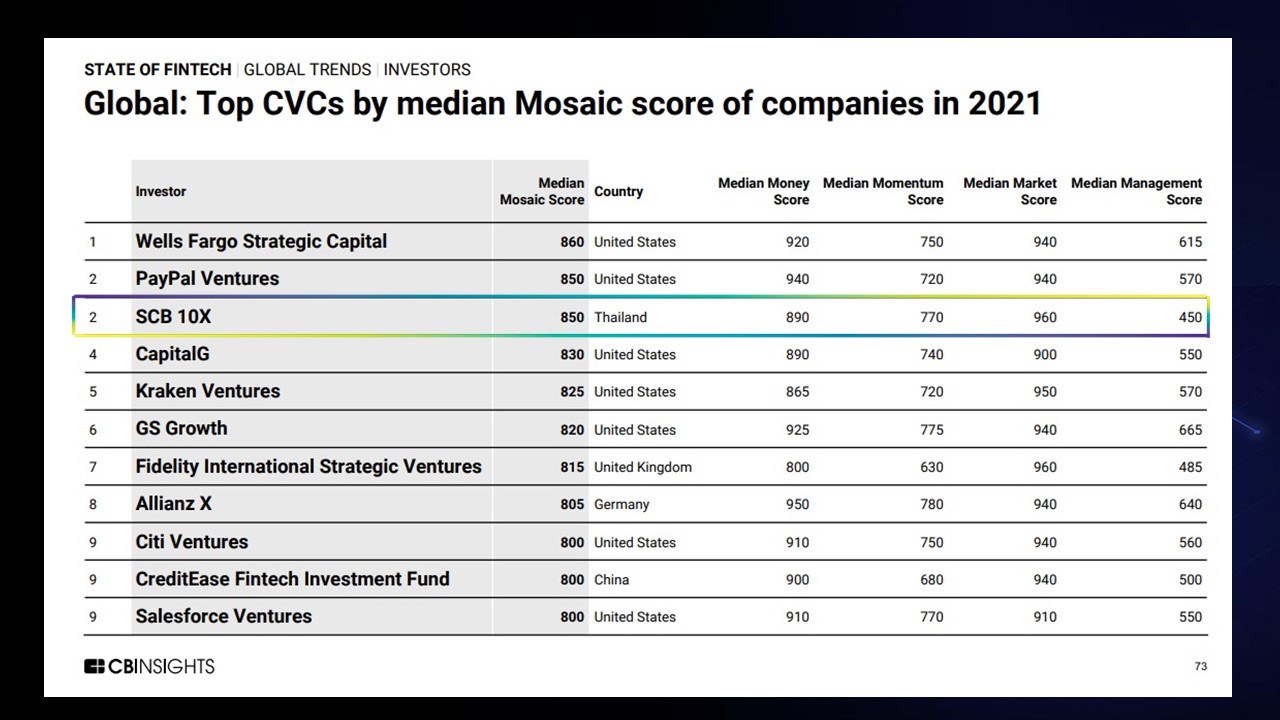เอสซีบี เท็นเอกซ์ (SCB 10X) บริษัทโฮลดิ้งคอมพานีในกลุ่มไทยพาณิชย์ ตอกย้ำความสำเร็จภารกิจ Moonshot Mission ด้านการลงทุนในบริษัทเทคคอมพานี และสตาร์ทอัพที่มีศักยภาพทั่วโลก ล่าสุด ขึ้นแท่น Corporate Venture Capital (CVC) หรือกองทุนที่จัดตั้งโดยบริษัทชั้นนำของโลก จากรายงานประจำปี “CB Insights State of Fintech Global 2021” จัดทำโดย CB Insights แพลตฟอร์มที่ให้บริการวิเคราะห์ข้อมูลเกี่ยวกับ Venture Capital และสตาร์ทอัพทั่วโลก โดย SCB 10X ได้รับการจัดให้อยู่ในอันดับที่ 2 ของกลุ่ม Global CVC ที่ลงทุนในสตาร์ทอัพด้าน Fintech และอันดับที่ 8 จาก CVC ทั่วโลก ซึ่งนับเป็นองค์กรแรกจากประเทศไทยที่ติดอันดับท็อปเท็นด้าน CVC ระดับโลก ซึ่งการได้รับการยอมรับในระดับโลกครั้งนี้ จะเป็นการเปิดประตูครั้งสำคัญที่ทำให้ประเทศไทยเป็นที่ยอมรับในระดับสากล และจะนำมาซึ่งโอกาสในการลงทุนและนวัตกรรมใหม่ ๆ ให้กับประเทศไทยอย่างแน่นอน