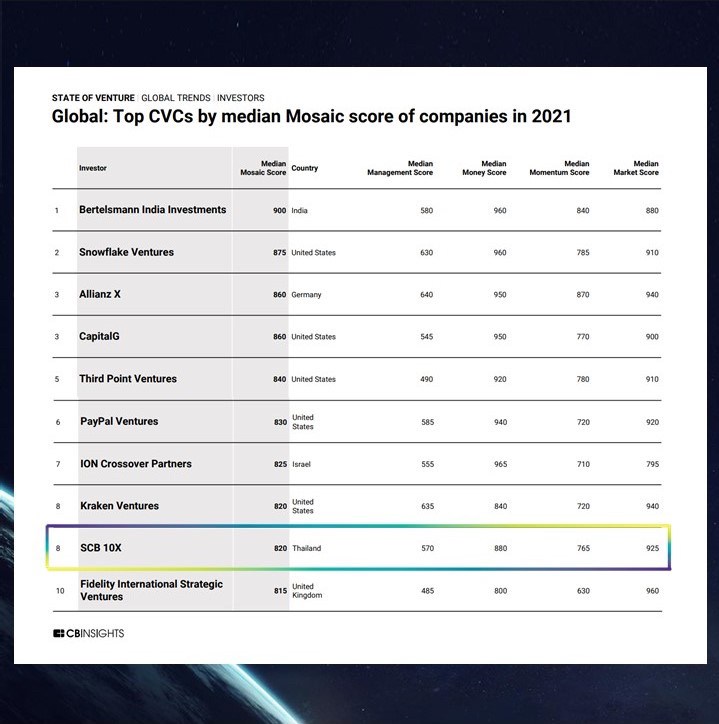 SCB 10X องค์กรแรกจากไทยที่ขึ้นชั้น Corporate Venture Capital ระดับโลก จัดอันดับโดย CB Insights สะท้อนศักยภาพและความสามารถด้านการลงทุนในเวทีสากล คว้าอันดับ 2 ใน Global CVC ที่ลงทุนในสตาร์ทอัพด้าน Fintech และอันดับ 8 จาก CVC ทั่วโลก