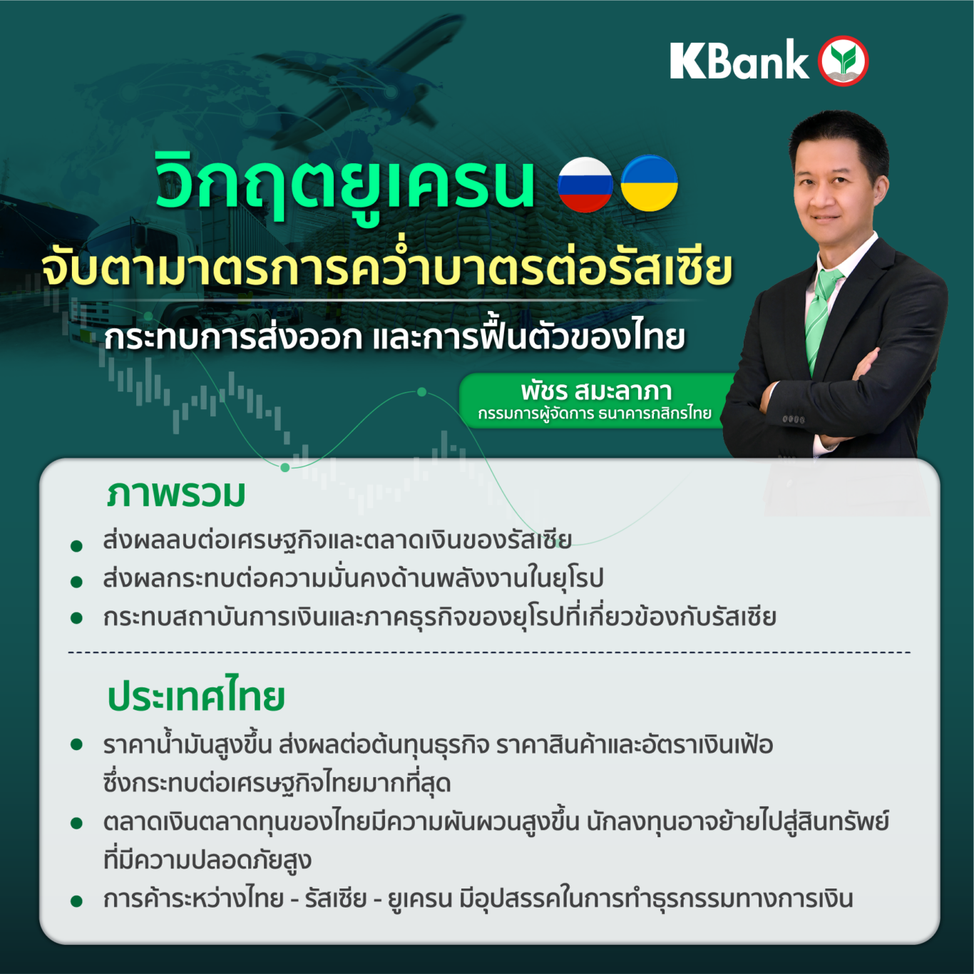 เคแบงก์ ชี้ผลกระทบวิกฤตรัสเซีย-ยูเครนต่อประเทศไทยขึ้นกับความยืดเยื้อและรุนแรง โดยภาพรวมขณะนี้ทำน้ำมันพุ่ง ต้นทุนธุรกิจและราคาสินค้าเตรียมขยับ ฝั่งลูกค้าของเคแบงก์ที่มีธุรกิจส่งออกไปรัสเซีย-ยูเครนยังไม่ได้รับผลกระทบมากนัก ให้จับตามาตรการคว่ำบาตรต่อรัสเซียของนานาประเทศที่อาจส่งผลต่อการทำธุรกรรมการเงินระหว่างประเทศ ระบุหากยื้อยาวเศรษฐกิจโลกจะเกิดภาวะเงินเฟ้อพุ่งสูง และไทยจะได้รับกระทบหนักและยาวหลังจากเพิ่งฟื้นตัวจากโควิด-19