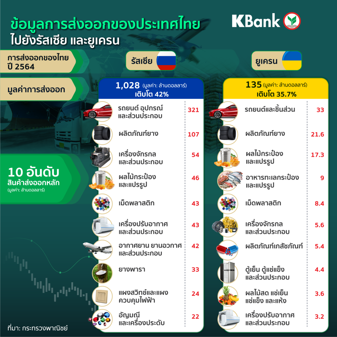 ส่วนยูเครนนั้น ในปี 2564 ไทยส่งออกไปเป็นมูลค่าประมาณ 135 ล้านดอลลาร์ฯ เติบโตสูง 35.7% เช่นกัน แต่สัดส่วนยังน้อยอยู่มาก โดยสินค้าส่งออกหลัก ได้แก่ รถยนต์และชิ้นส่วน ผลิตภัณฑ์ยาง ผลไม้กระป๋องและแปรรูป อาหารทะเลกระป๋องและแปรรูป เม็ดพลาสติก เป็นต้น
