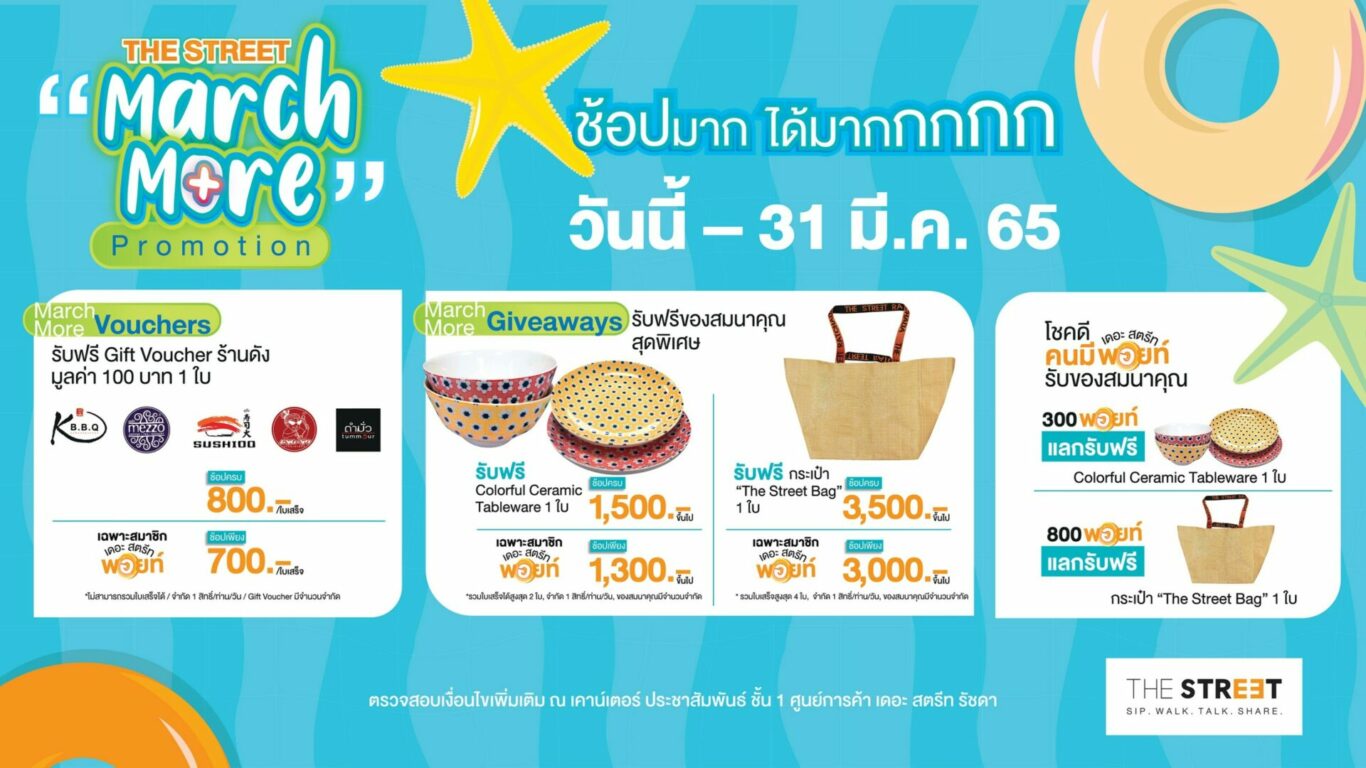 “The Street March More Promotion” ช้อปมาก ได้มาก ประกอบด้วยโปรโมชัน March More ‘Vouchers’ และ March More ‘Giveaways’ โดยมีรายละเอียด ดังนี้