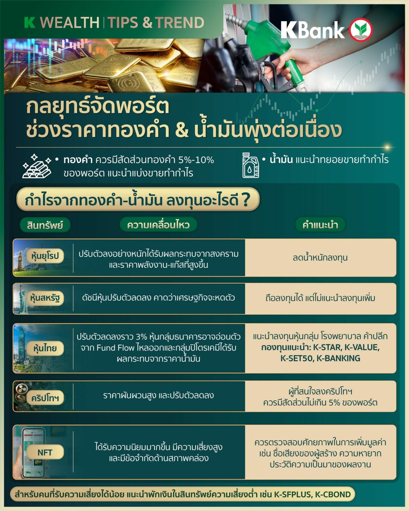 K WEALTH โดย ธนาคารกสิกรไทย แนะนำกลยุทธ์ปรับพอร์ตช่วงราคาทองคำและน้ำมันขึ้นสูงเป็นประวัติการณ์ ให้ทยอยขายบางส่วน นำกำไรมาลงทุนต่อในสินทรัพย์อื่น ๆ ที่ราคากำลังย่อตัว เพื่อโอกาสรับผลตอบแทนในระยะยาว
