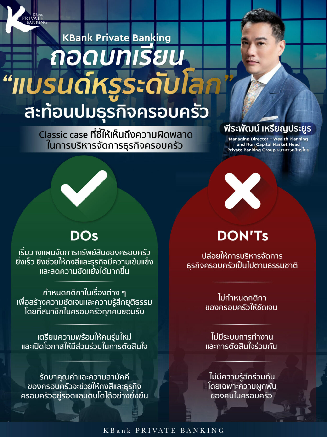 “สุดท้ายนี้ หากใครมีโอกาสได้ดูภาพยนตร์เรื่องนี้แล้ว อย่าลืมย้อนกลับมาดูธุรกิจครอบครัวของตนเองด้วยว่ามีอะไรที่เราได้ทำพลาดเหมือนตระกูลดังกล่าวหรือไม่ KBank Private Banking ในฐานะผู้ให้บริการไพรเวทแบงก์ที่มีความเชี่ยวชาญด้าน ‘บริการที่ปรึกษาด้านการบริหารทรัพย์สินครอบครัว’ (Family Wealth Planning Service) มุ่งมั่นพัฒนาคุณภาพบริการอย่างต่อเนื่อง เพื่อช่วยให้ทุกๆ ครอบครัวสามารถวางแผนและดำเนินการบริหารธุรกิจครอบครัวได้อย่างมีประสิทธิภาพและเป็นกำลังขับเคลื่อนที่สำคัญของระบบเศรษฐกิจไทยต่อไป” นายพีระพัฒน์ กล่าวปิดท้าย