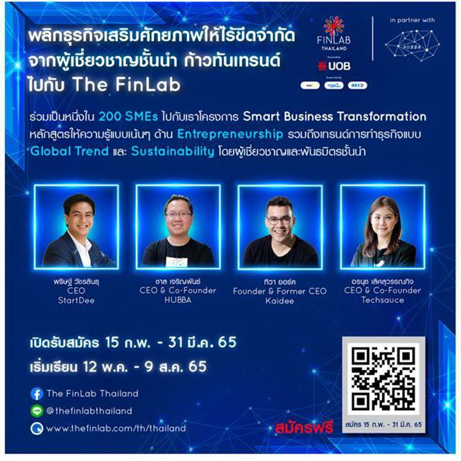 โครงการ SBTP เปิดรับเจ้าของธุรกิจ SMEs หรือผู้มีอำนาจในการตัดสินใจ ที่พร้อมเปิดรับแนวคิดใหม่ในการทำธุรกิจ มีความกระตือรือร้นในการปรับตัวเข้ากับเทคโนโลยีและความพร้อมในการลงทุนด้านเครื่องมือดิจิทัล และสามารถให้เวลากับโครงการได้อย่างเต็มที่ตลอดระยะเวลาสามเดือนของโครงการ ผู้ประกอบการ SMEs ที่มีความสนใจ สามารถสมัครเข้าร่วมโครงการ SBTP ได้ตั้งแต่วันนี้จนถึงวันที่ 31 มี.ค.นี้ และเริ่มเรียนตั้งแต่วันที่ 12 พ.ค. – 9 ส.ค.นี้ สมัครฟรี ได้ที่ www.facebook.com/uob.th หรือ https://thefinlab.com/th/thailand