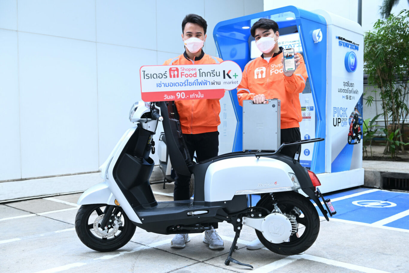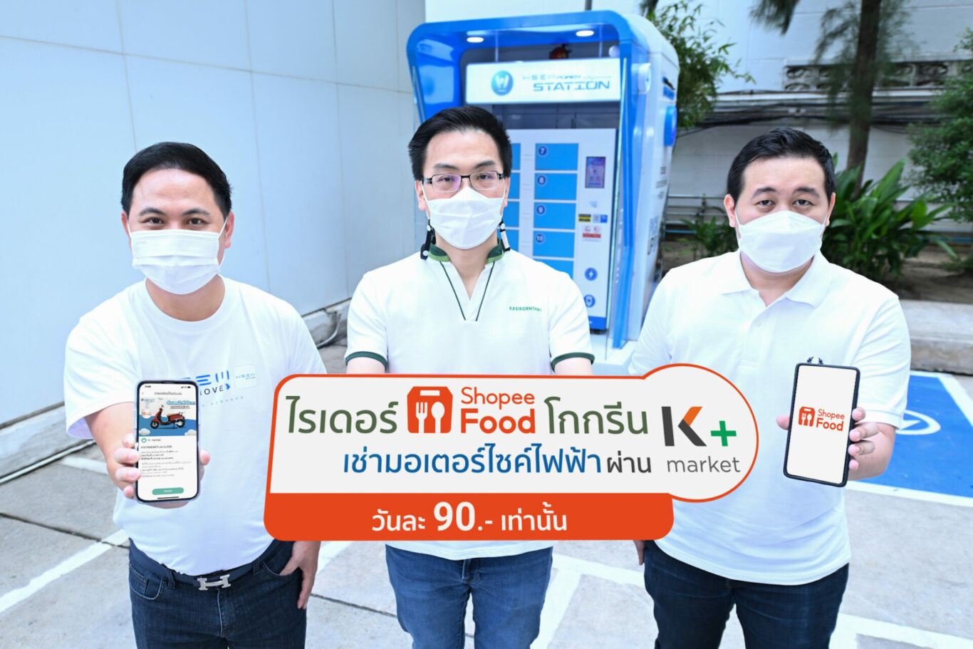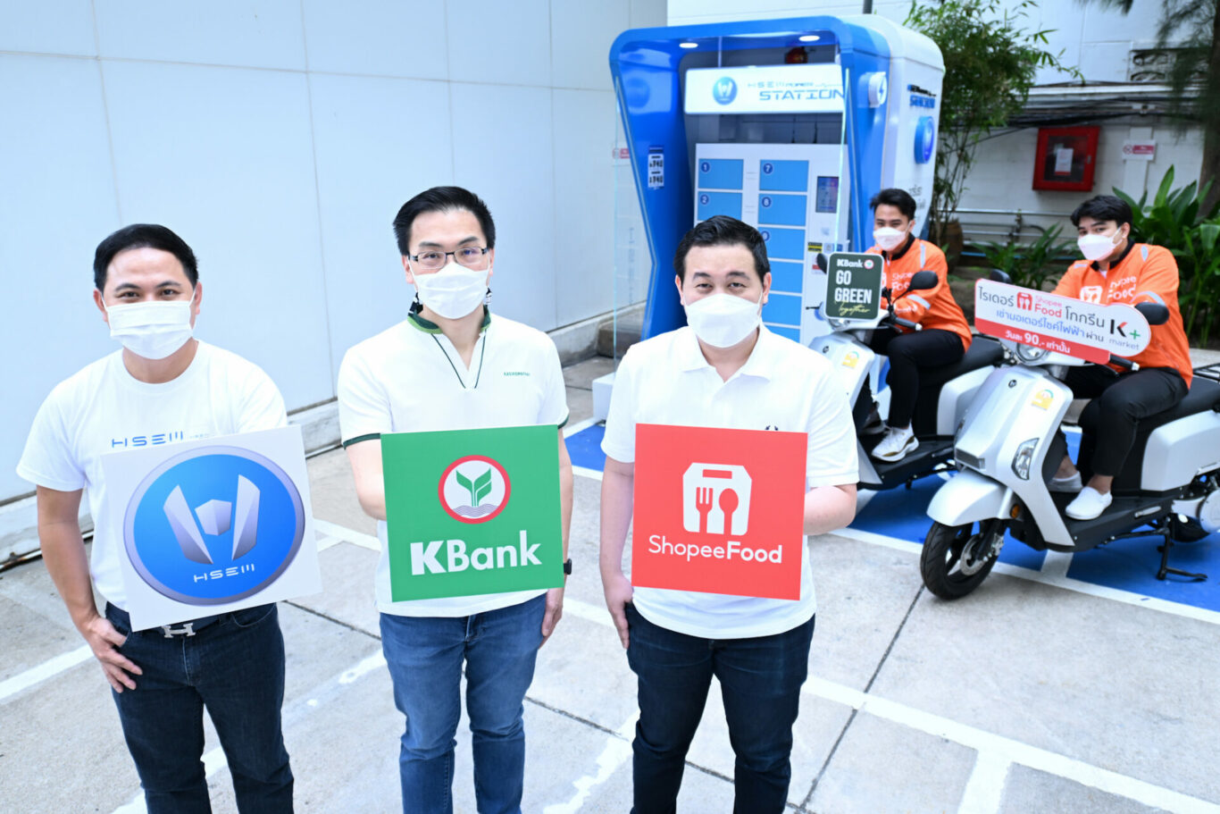 ดร. กรินทร์ บุญเลิศวณิชย์ (กลาง) รองกรรมการผู้จัดการ ธนาคารกสิกรไทย นายวันชัย  ลี้นะวัฒนา (ซ้าย)  ประธานเจ้าหน้าที่บริหาร บริษัท เอช เซม มอเตอร์ จำกัด และ นายฐานิศร์ สุวรรณกุล (ขวา) ผู้อำนวยการฝ่ายพัฒนาธุรกิจและการตลาด  ShopeeFood (ประเทศไทย) เปิดตัวโปรโมชันพิเศษเฉพาะไรเดอร์ ShopeeFood รับส่วนลดค่าเช่ามอเตอร์ไซค์ไฟฟ้าผ่านแอป K+ market เหลือเพียง 90 บาทต่อวัน สำหรับการเช่ารถ 30 วัน และ 120 บาทต่อวัน สำหรับการเช่ารถระยะสั้น 1, 5, 7, 15 วัน ตั้งแต่วันนี้ ถึง 30 เมษายน 2565