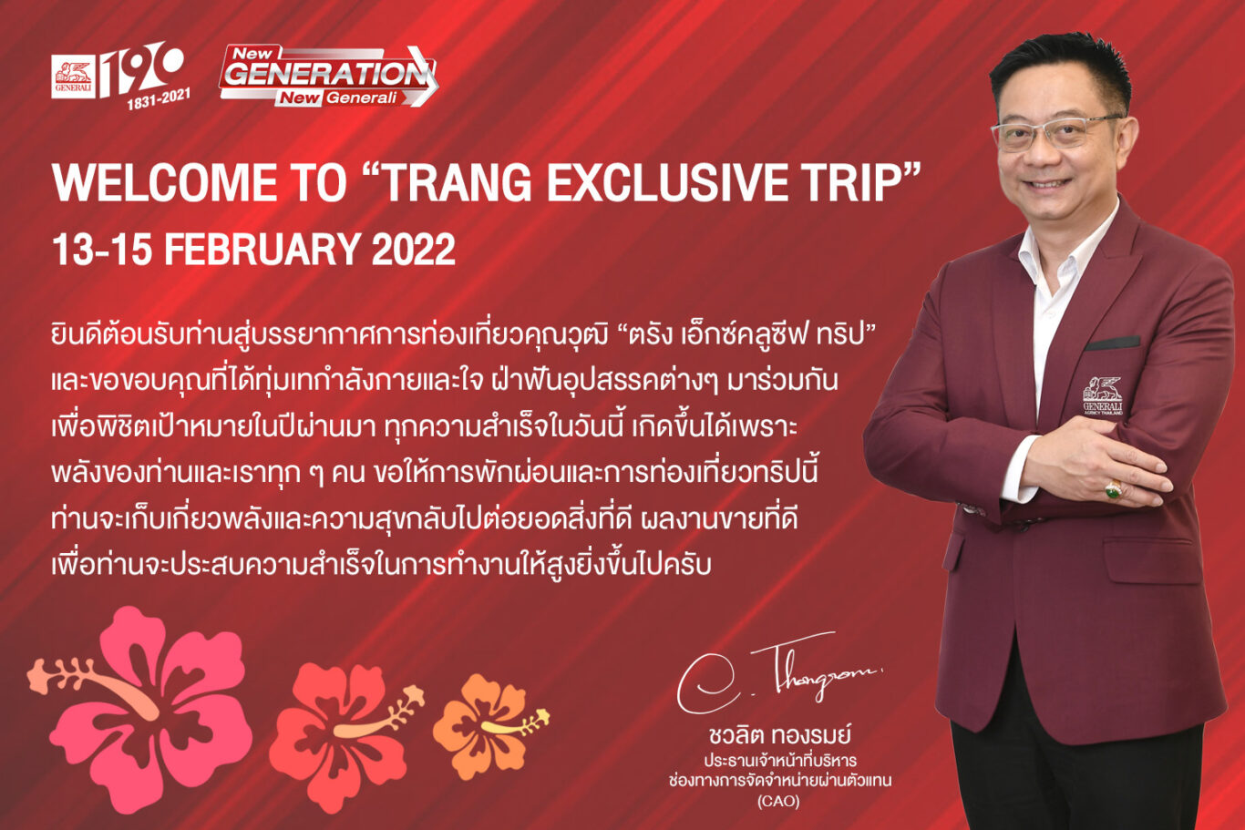 โดยได้รับเกียรติจาก นายชวลิต ทองรมย์ ประธานเจ้าหน้าที่บริหาร ฝ่ายช่องทางจัดจำหน่ายผ่านตัวแทน (CAO) บริษัท เจนเนอราลี่ ประกันชีวิต (ไทยแลนด์) จำกัด (มหาชน) ร่วมเดินทางใกล้ชิด เพื่อต้อนรับและดูแลตัวแทนที่มีผลงานยอดเยี่ยมเข้าร่วมกิจกรรมท่องเที่ยว พร้อมให้ความรู้และเทคนิคด้านการขายตามกลยุทธ์การพัฒนาตัวแทนจำหน่ายปี 2565 ของเจนเนอราลี่ ไทยแลนด์ ที่มุ่งส่งเสริมศักยภาพตัวแทนจำหน่ายให้มีความเชี่ยวชาญด้านดิจิทัล พร้อมการปลูกฝังให้มีความรู้ความชำนาญเฉพาะด้าน อาทิ ผู้เชี่ยวชาญด้านประกันชีวิต (Insurance Specialist) นักออกแบบสินทรัพย์ (Asset Designer) และที่ปรึกษาความมั่งคั่ง (Wealth Advisor) เป็นต้น เพื่อให้ตัวแทนจำหน่ายได้ยกระดับการให้บริการเตรียมพร้อมรับมือลูกค้าที่มีความต้องการที่หลากหลายและเฉพาะทางมากยิ่งขึ้น
