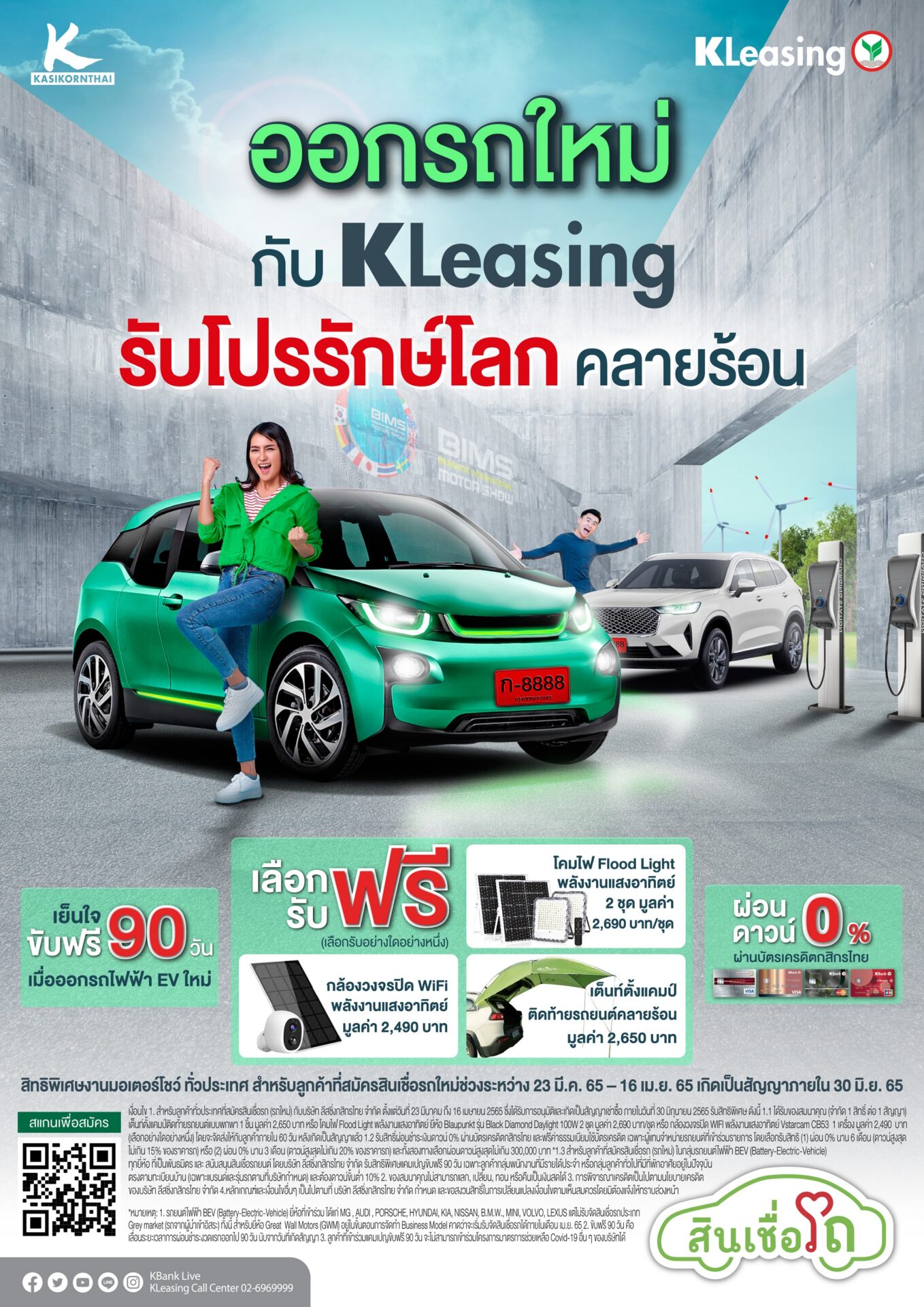 และพิเศษสำหรับลูกค้าที่ออกรถยนต์ไฟฟ้าBEVใหม่ รับสิทธิ์ขับฟรี 90 วัน พร้อมเลือกรับของสมนาคุณรักษ์โลก อาทิ เต็นท์ตั้งแคมป์ติดท้ายรถยนต์ โคมไฟพลังงานแสงอาทิตย์ และกล้องวงจรปิดไวไฟพลังงานแสงอาทิตย์ เฉพาะลูกค้าที่สมัครสินเชื่อรถใหม่ตั้งแต่วันที่ 23 มี.ค.-16 เม.ย.65 และออกรถภายในวันที่ 30 มิ.ย.65 ในงานมอเตอร์โชว์ 2022 และโชว์รูมผู้แทนจำหน่ายรถทั่วประเทศ หรือสมัครผ่านช่องทางออนไลน์ที่เว็บไซต์ www.kasikornbank.com หรือ แอปพลิเคชัน K PLUS