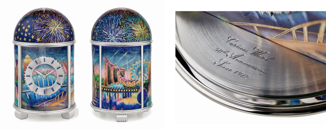 สำหรับรุ่นถัดมา Ref. 20145M-001 ‘Singapore Skyline’ นั้นเป็นนาฬิกาตั้งโต๊ะทรงโดมลงยาแบบ Cloisonné enamel หน้าปัดจากโลหะเงินที่เป็นประกายแวววาวและใช้สีทองและสีเงินอย่างสวยงาม ภายใต้แนวคิด ความงดงามของทัศนียภาพของประเทศ สิงคโปร์ ซึ่งมีตัวแมสคอต Merlion ตั้งอยู่ในบริเวณเขตพื้นที่ธุรกิจ มีสวน Gardens by the bay, Esplanade, และ Marina Bay Sands ซึ่งเป็นที่ตั้งร้านบูติก ของ Patek Philippe ที่เปิดเป็นแห่งที่สองในประเทศสิงคโปร์ โดยบริษัท Cortina Watch ในการประดิษฐ์รูปร่างขอบฟ้าและรูปอนุสาวรีย์ต่าง ๆ นั้น ช่างเคลือบใข้ ทองคำ 24k ถึง 9.2 เมตร ในการผลิต โดยมีสัดส่วน 0.2 x 0.6 มม. โดยได้ตัดให้เป็นชิ้นส่วนเล็ก ๆ และประดิษฐ์ขึ้นด้วยมือทั้งสิ้น ในการประดิษฐ์รูปภาพด้านหลังมีการจัดแต้มสีต่าง ๆ โดยใช้วิธีการที่ละเอียดอ่อนที่สุดโดยลงสีเป็นชั้น ๆ  ขั้นตอนการลงยา ใช้กว่า 50 สีในการผลิตครั้งนี้ มี 47 สีเป็นสีแบบใส และมี 1 สีแบบทึบแสง และอีก 2 สีที่เป็นสีเหลือบ ในการลงยาแต่ละชิ้น จะต้องมีการเผาประมาณ 10-14 ครั้งที่อุณหภูมิสูงระหว่าง 890 ถึง 910  องศาเซลเซียส ในส่วนของดาวและแสงพลุนั้น ได้ประดิษฐ์ไว้ในรูปแบบกระจายตัวของดาวห้าสิบดวงและแสงประกายของพลุไฟ สิ่งเหล่านี้ทำมาจากทองคำและเงินอย่างสวยงาม โดยทำให้เป็นในรูปแบบกระจายทั่วท้องฟ้า เพื่อเป็นสัญลักษณ์การเฉลิมฉลอง 50 ปี ในส่วนของหน้าปัดบอกเวลานั้น ใช้การสลักแบบกิโยเช่ ประดิษฐ์ในรูปแบบหยักเข้าออกเพื่อให้เป็นรูปร่างคล้ายดอกไม้ในสวน โดยจัดเข็มบอกเวลาแบบแนวตรง 12 แท่ง ซึ่งทำมาจาก หิน Lapis Lazuli 2.27 กะรัต โดยวางล้อมหน้าปัดกลางที่ลงยาแบบ cloisonné enamel และมีการแกะสลักชื่อ “Cortina Watch – 50th Anniversary – Since 1972”   นาฬิกาโดมนี้ใช้ Caliber 17 นิ้ว แบบ PEND Mechanical Movement โดยสามารถไขลานโดยใช้มอเตอร์ไฟฟ้า