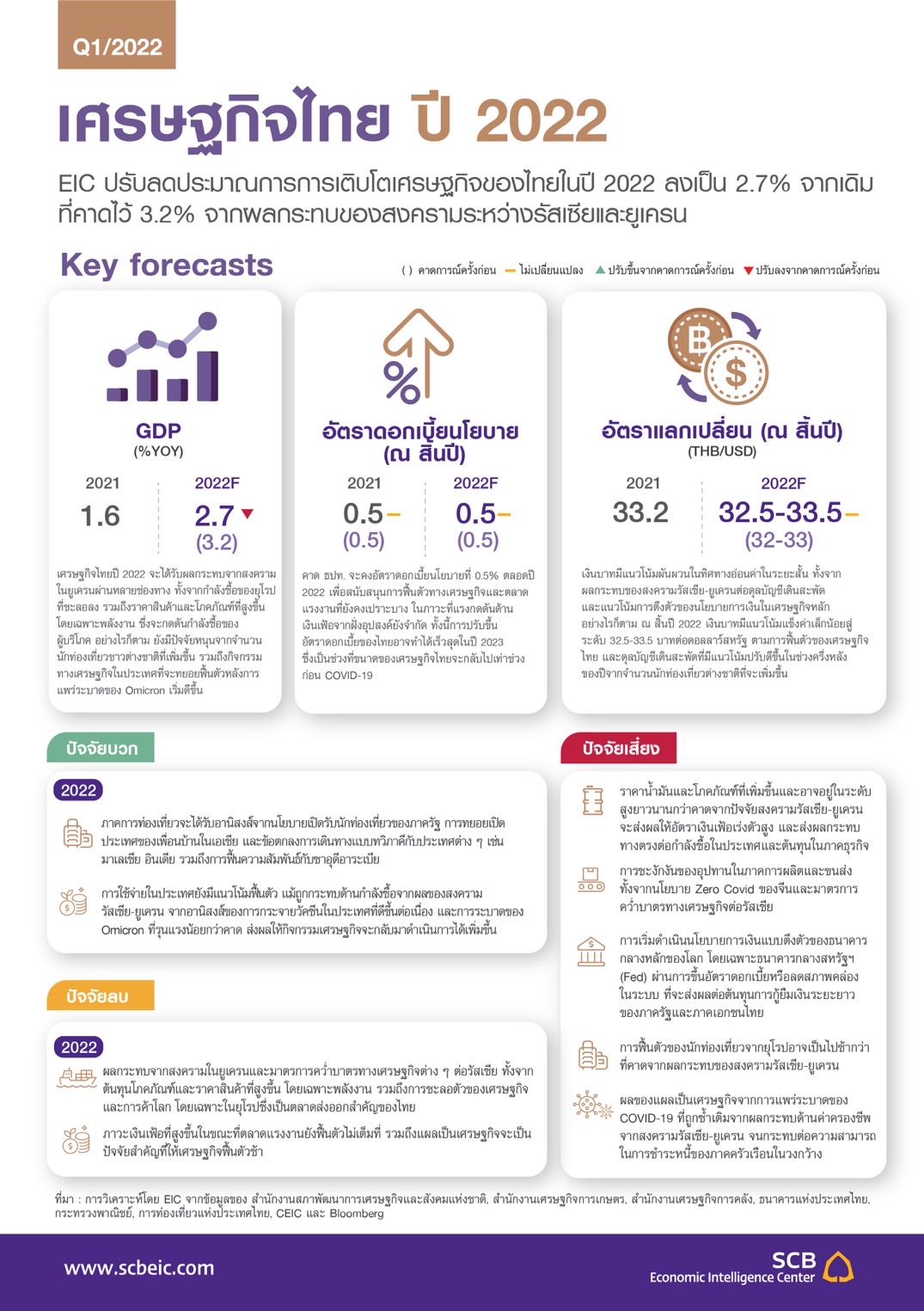EIC ปรับลดประมาณการเศรษฐกิจไทยปี 2565 เติบโตที่ 2.7% จากเดิม 3.2% จากผลกระทบของสงครามรัสเซีย-ยูเครน ที่ทำให้ราคาพลังงานและเงินเฟ้อเร่งตัว กระทบกำลังซื้อ และความเชื่อมั่นของภาคครัวเรือนและภาคธุรกิจ ส่งผลให้การกลับไปสู่ระดับ GDP รายปีก่อนเกิดโควิดของไทยล่าช้าเป็นครึ่งหลังของปีหน้า