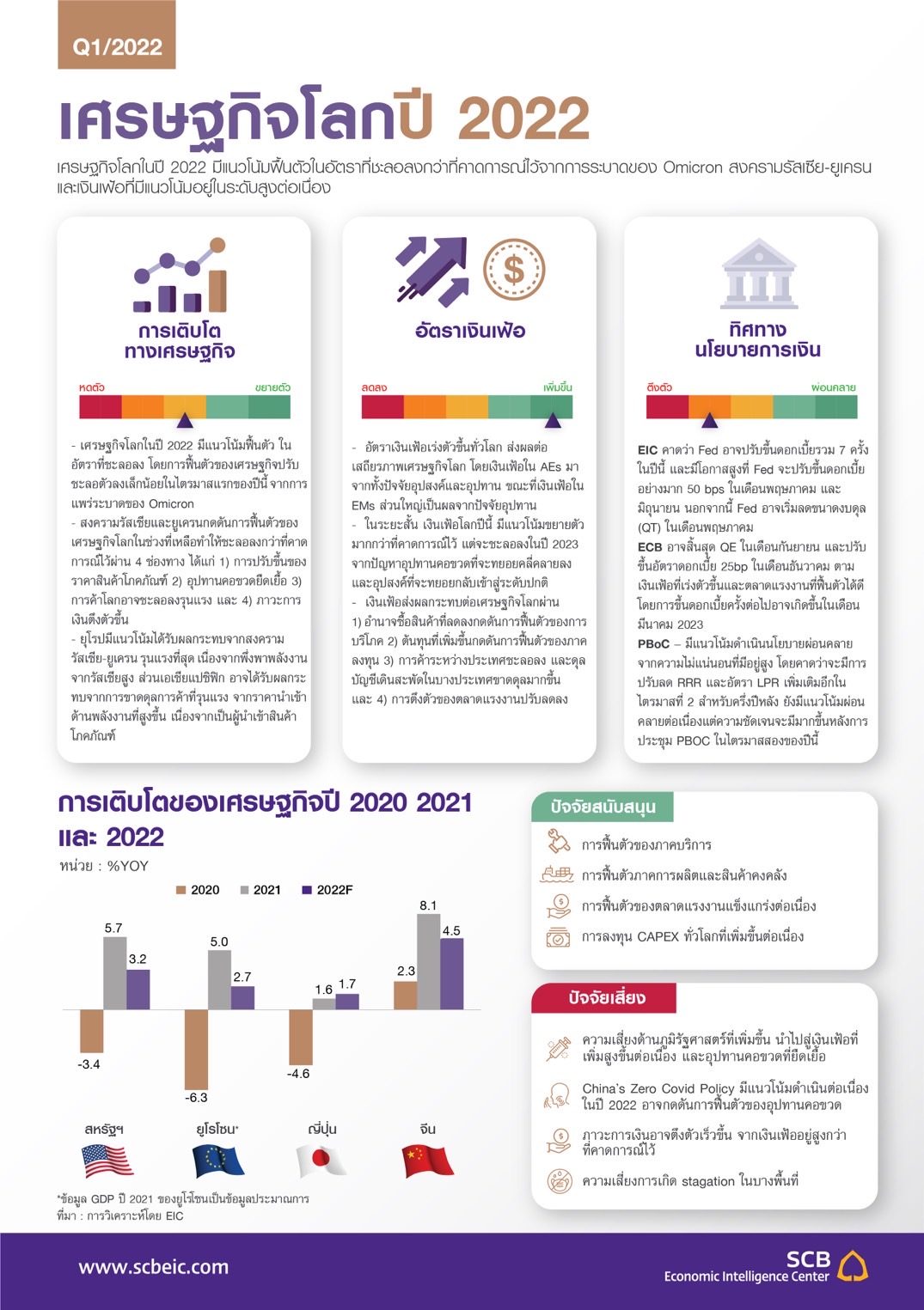 ในภาพรวม อัตราเงินเฟ้อที่เร่งตัวขึ้นเร็วและจะยืนอยู่ในระดับสูงตลอดช่วงปีนี้ท่ามกลางข้อจำกัดด้านมาตรการการกระตุ้นเศรษฐกิจของภาครัฐและแผลเป็นทางเศรษฐกิจที่มีอยู่เดิม จะส่งผลให้การฟื้นตัวของเศรษฐกิจไทยเป็นไปอย่างช้า ๆ โดยระดับ GDP รายปี จะยังไม่กลับไปเท่าระดับของปี 2562 จนกระทั่งช่วงครึ่งหลังของปี 2566