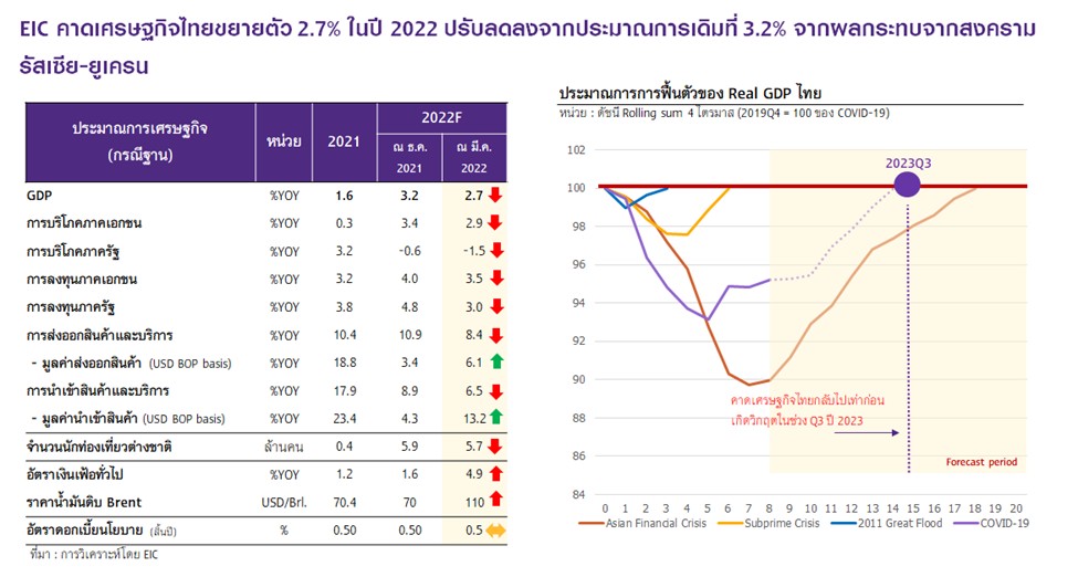 EIC ปรับลดประมาณการเศรษฐกิจไทยปี 2565 เติบโตที่ 2.7% จากเดิม 3.2% จากผลกระทบของสงครามรัสเซีย-ยูเครน