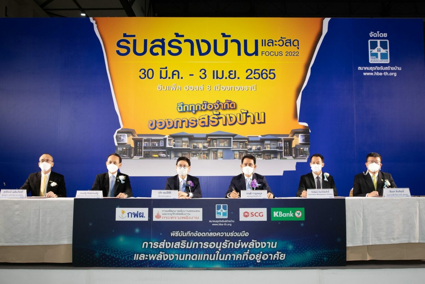 นายชัยยศ ตันพิสุทธิ์ (ขวาสุด) ผู้ช่วยกรรมการผู้จัดการ ธนาคารกสิกรไทย ลงนามความร่วมมือ “การส่งเสริมการอนุรักษ์พลังงานและพลังงานทดแทนในภาคที่อยู่อาศัย” ร่วมกับ 4 หน่วยงาน คือ สมาคมธุรกิจรับสร้างบ้าน กรมพัฒนาพลังงานทดแทนและอนุรักษ์พลังงาน การไฟฟ้าฝ่ายผลิตแห่งประเทศไทย และ บริษัท เอสซีจี ซีเมนต์-ผลิตภัณฑ์ก่อสร้าง จำกัด โดยมี นายกุลิศ สมบัติศิริ (ที่ 3 จากซ้าย) ปลัดกระทรวงพลังงาน เป็นประธานในงาน เพื่อส่งเสริมการออกแบบการสร้างและการจำหน่ายบ้านประหยัดพลังงาน และส่งเสริมการใช้พลังงานทดแทนในภาคครัวเรือนไทยให้เกิดขึ้นจริง
