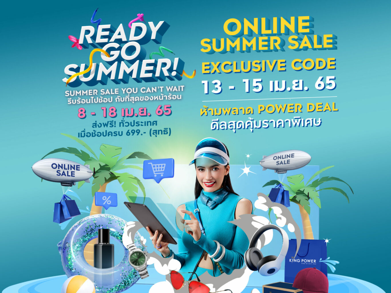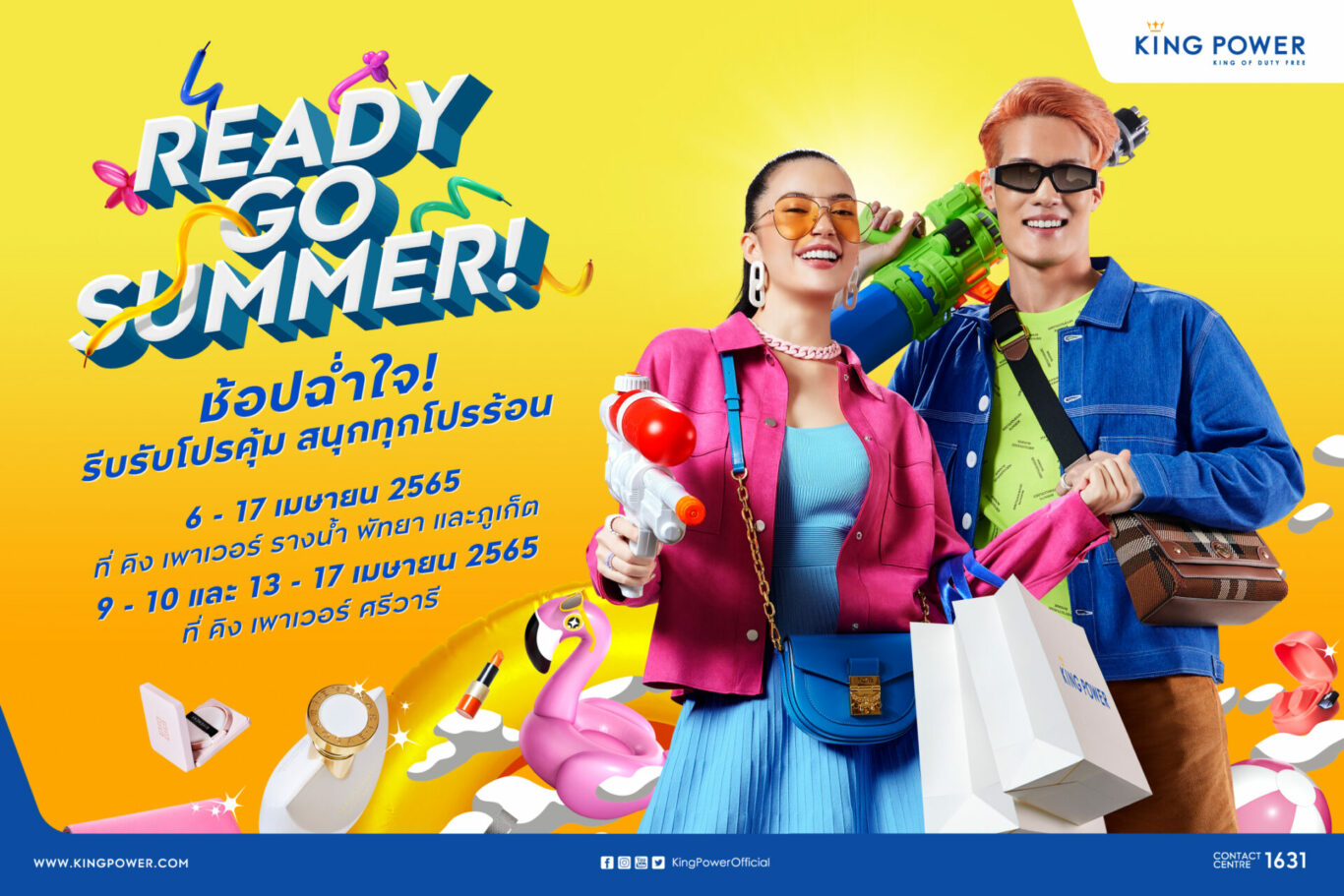 เตรียมตัวให้พร้อมกับการเดินทางครั้งใหม่ สนุกกับการช้อปไปกับแคมเปญ READY GO SUMMER ช้อปฉ่ำใจ รีบรับโปรคุ้ม สนุกทุกโปรร้อน ที่คิง เพาเวอร์ รางน้ำ, พัทยา, ภูเก็ต ระหว่างวันที่ 6 – 17 เมษายน 2565 และศรีวารี ระหว่างวันที่ 9 -10 และ 13 – 17 เมษายน 2565
