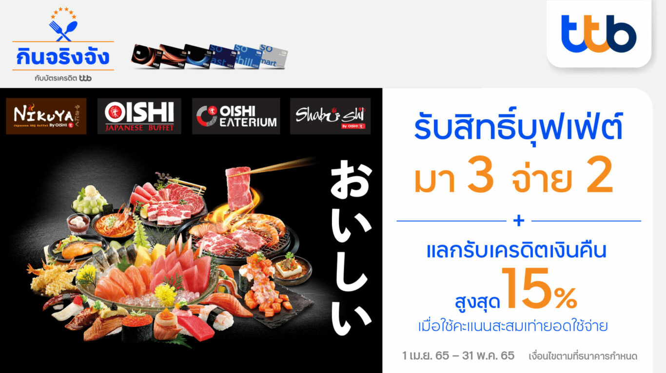 บัตรเครดิต ทีทีบี ชวนอิ่มคุ้มแบบไม่อั้น รับสิทธิ์มา 3 จ่าย 2 เมื่อทานอาหารในเครือโออิชิ พร้อมแลกรับเครดิตเงินคืนสูงสุด 15%