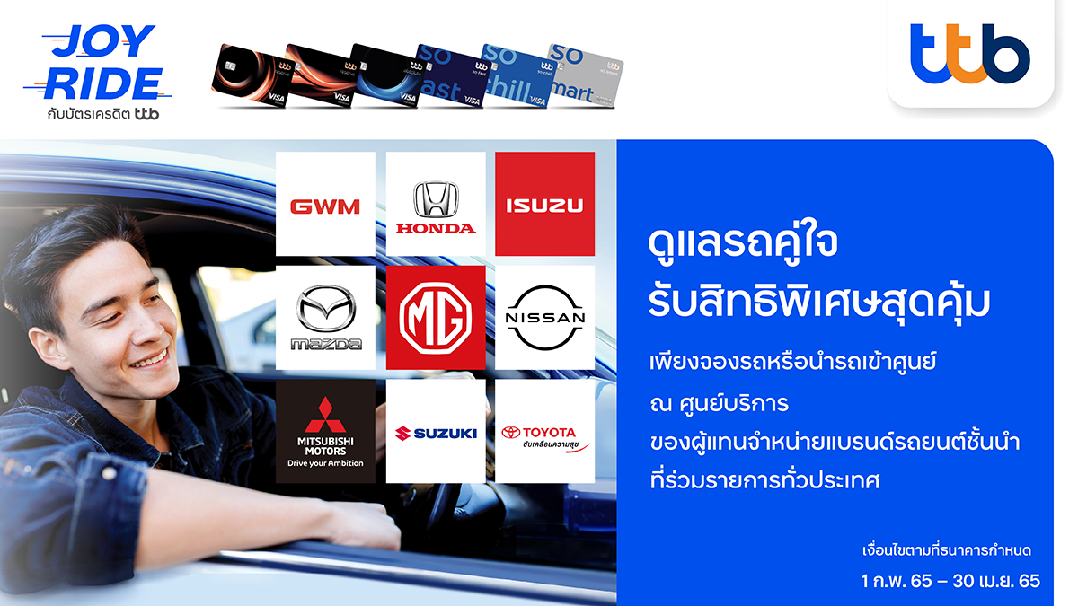 บัตรเครดิต ทีทีบี ชวนดูแลรถคู่ใจ และมอบความคุ้มค่าให้กับลูกค้าบัตรเครดิต ทีทีบี ที่จองรถหรือนำรถเข้าศูนย์ ณ ศูนย์บริการของผู้แทนจำหน่ายแบรนด์รถยนต์ชั้นนำที่ร่วมรายการทั่วประเทศ ได้แก่ เกรท วอลล์ มอเตอร์ ฮอนด้า อีซูซุ  มาสด้า เอ็มจี  มิตซูบิชิ นิสสัน ซูซุกิ และ โตโยต้า โดยจัดเต็ม 2 สิทธิพิเศษสุดคุ้ม ได้แก่ รับเครดิตเงินคืนสูงสุด 10,000 บาท และแลกรับเครดิตเงินคืนสูงสุด 15% ตั้งแต่วันนี้ ถึง 30 เมษายน 2565