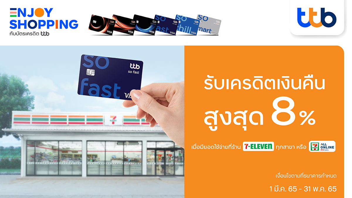 บัตรเครดิต ทีทีบี ร่วมกับ 7-ELEVEN มอบสิทธิพิเศษสำหรับลูกค้าคนสำคัญของบัตรเครดิต ทีทีบี ได้เพลิดเพลินกับการใช้จ่ายภายในร้านสะดวกซื้อ 7-ELEVEN ทุกสาขา หรือสั่งซื้อสินค้าผ่านทาง ALL Online by 7-ELEVEN รับเครดิตเงินคืนสูงสุด 8% ตั้งแต่วันนี้ถึง 31 พฤษภาคม 2565 ทั้งนี้ เมื่อมียอดใช้จ่ายสะสมตลอดรายการครบทุก 1,500 บาท รับเครดิตเงินคืน 120 บาท โดยลงทะเบียนเพื่อรับเครดิตเงินคืนพิมพ์ TSV ตามด้วยหมายเลขบัตรเครดิต 12 หลักสุดท้าย ส่งมาที่ 4806026 บัตรเครดิต ทีทีบี รีเซิร์ฟ สามารถรับเครดิตเงินคืนได้โดยไม่ต้องลงทะเบียน