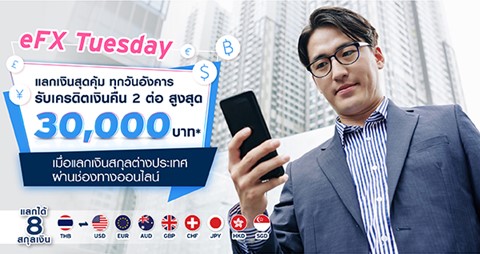 กรุงเทพฯ 29 เมษายน 2565 – ธนาคารซิตี้แบงก์ เปิดตัว “eFX Tuesday” โปรโมชันแลกเงินสกุลต่างประเทศสุดคุ้ม ทุกวันอังคาร สำหรับลูกค้าบุคคล ไม่ว่าจะแลกเงินเพื่อทำธุรกรรม ช้อปปิ้งออนไลน์ ลงทุนในกองทุนรวมหรือตราสารหนี้ต่างประเทศ หรือโอนเงินไปต่างประเทศ ให้สามารถทำรายการแลกเปลี่ยนเงินตราต่างประเทศระหว่างบัญชีภายในธนาคาร ระหว่างสกุลเงินไทยบาท และอีก 8 สกุลเงินต่างประเทศ ประกอบไปด้วย ดอลลาร์สหรัฐ (USD) ยูโร (EUR) ปอนด์ (GBP) ดอลลาร์สิงคโปร์ (SGD) เยน (JPY) ฟรังค์สวิส (CHF) ดอลลาร์ออสเตรเลีย (AUD) และดอลลาร์ฮ่องกง (HKD) ได้อย่างสะดวกง่ายดายผ่านช่องทางซิตี้โมบายล์แอป และซิตี้แบงก์ ออนไลน์ ตลอด 24 ชั่วโมง พร้อมมอบข้อเสนอสุดคุ้ม 2 ต่อ โดยต่อแรกรับเครดิตเงินคืน 2,000 บาท ทุก ๆ ยอดแลกเงิน 20,000 ดอลลาร์สหรัฐหรือเทียบเท่าในวันอังคาร (สูงสุด 20,000 บาท) ต่อที่ 2 รับเครดิตเงินคืนเพิ่มเป็น 30,000 บาท เมื่อมียอดแลกเงินตลอดทั้งโปรแกรมในวันอังคาร รวม 300,000 ดอลลาร์สหรัฐหรือเทียบเท่าขึ้นไป นอกจากนี้พิเศษสำหรับผู้ใช้ใหม่ รับเครดิตเงินคืนเพิ่มอีก 1,000 บาท เงื่อนไขเป็นไปตามที่ธนาคารฯ กำหนด ทั้งนี้โปรโมชันดังกล่าวเริ่มตั้งแต่วันนี้ ถึงวันที่ 28 มิถุนายน 2565