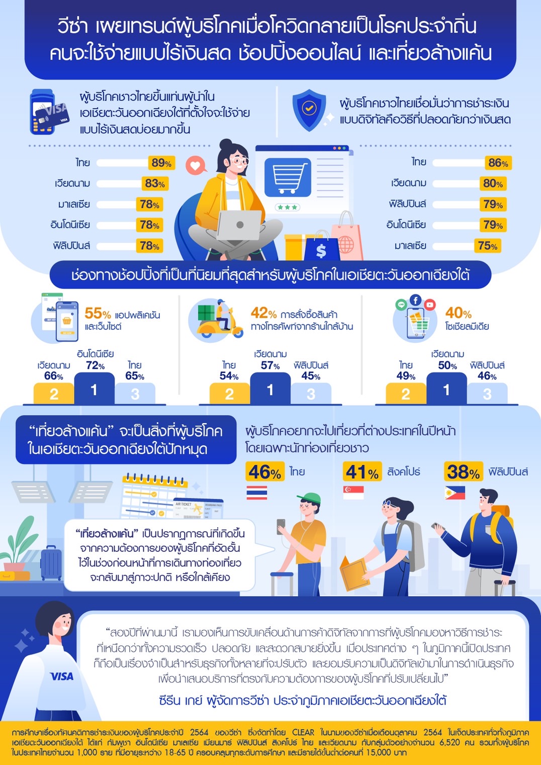 กรุงเทพฯ ประเทศไทย เมื่อวันที่ 31 พฤษภาคม 2565 – วีซ่า ผู้นำการให้บริการการชำระเงินดิจิทัลระดับโลก เผยข้อมูลจากการศึกษาเรื่องทัศนคติการชำระเงินของผู้บริโภคประจำปีของวีซ่า (Visa Consumer Payment Attitudes Study) ว่าการใช้จ่ายแบบไร้เงินสด การช้อปปิ้งออนไลน์ และการเที่ยวล้างแค้น คือสามเทรนด์ผู้บริโภคหลักที่จะเกิดขึ้นในภูมิภาคเอเชียตะวันออกเฉียงใต้หลังโควิดถูกลดระดับสู่โรคประจำถิ่น