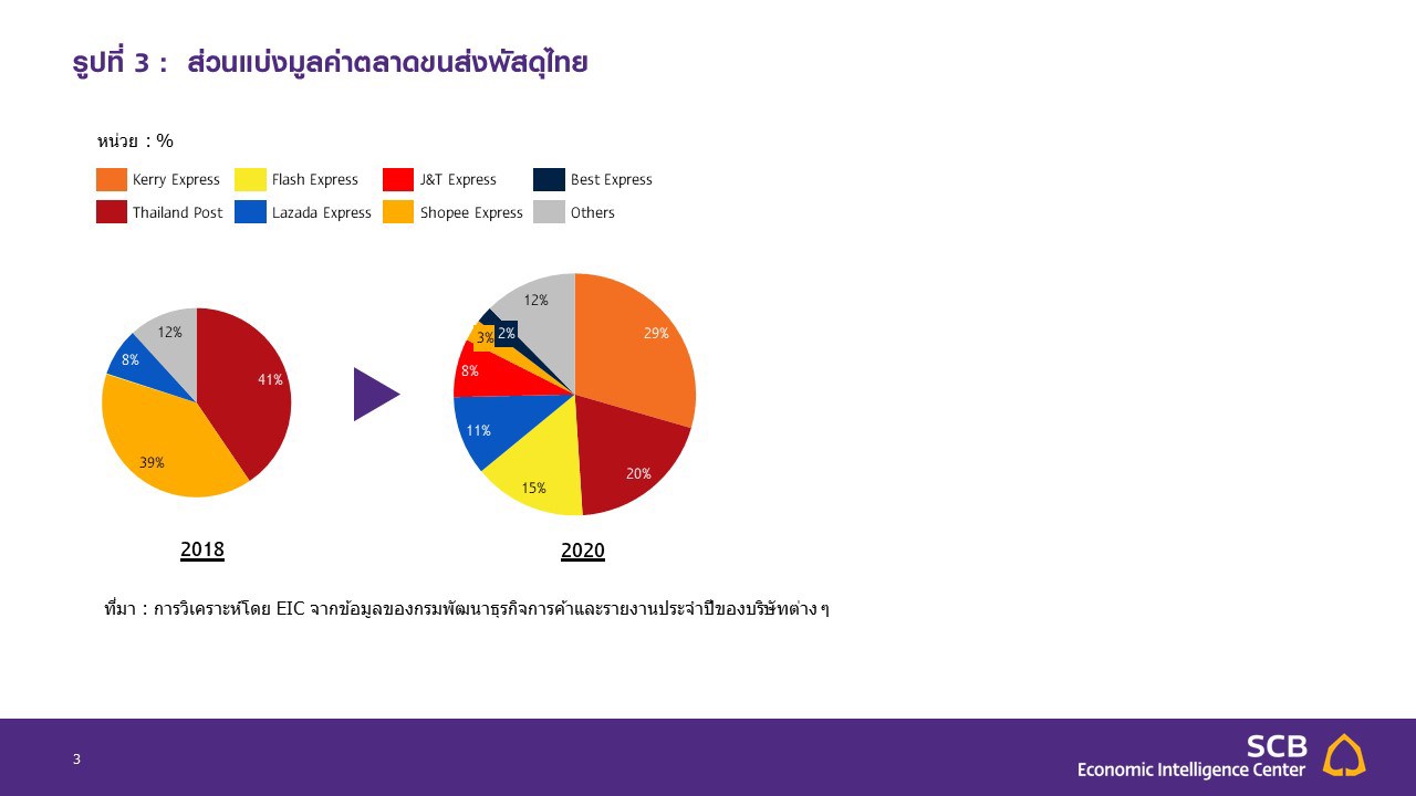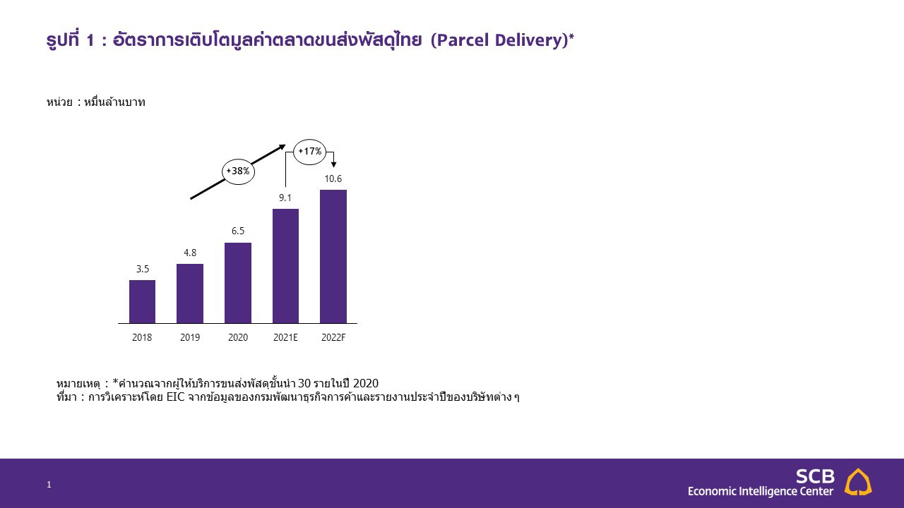 ตลาดขนส่งพัสดุไทยในปี 2022 มีแนวโน้มเติบโตขยายตัวต่อเนื่องตามการเติบโตของ E-Commerce ที่เร่งตัวขึ้นในยุค COVID-19 และมีแนวโน้มเติบโตต่อเนื่องจนกลายเป็น new normal