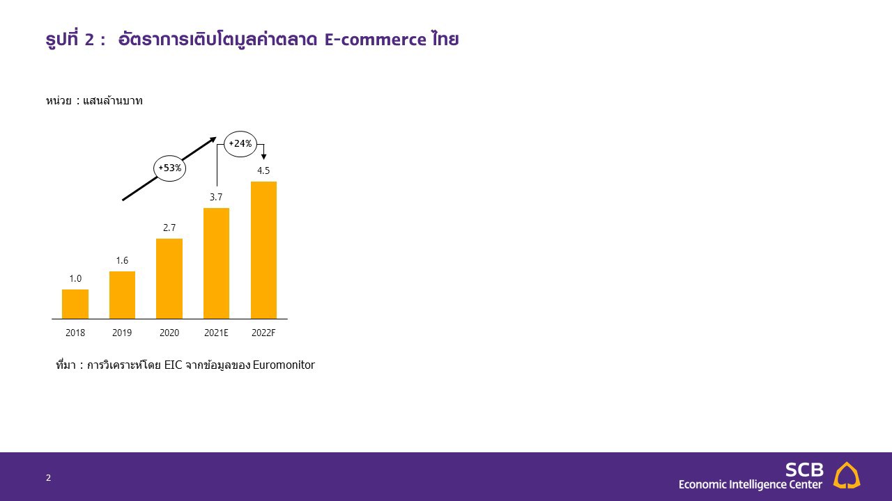 ในระดับสูงที่ราว 38%CAGR และมีมูลค่ากว่า 9.1 หมื่นล้านบาทในปี 2021 เนื่องจากพฤติกรรมผู้บริโภคที่หันมาซื้อสินค้าผ่านทางออนไลน์หรือ E-commerce มากยิ่งขึ้นโดยเฉพาะในช่วงที่มีการใช้มาตรการควบคุมโรคอย่างเข้มงวด