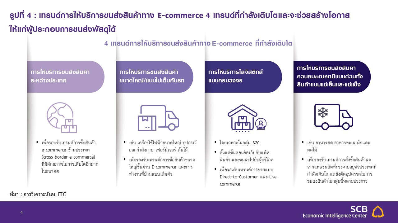 EIC ประเมินเทรนด์การให้บริการขนส่ง 4 เทรนด์ที่กำลังเติบโตและจะกลายเป็นโอกาสให้แก่ผู้ประกอบการขนส่งพัสดุในการขยายบริการสู่ตลาดใหม่ ๆ เนื่องจากสงครามราคาที่ดุเดือดในตลาดขนส่งพัสดุที่เป็นตลาด Red Ocean ผู้ประกอบการควรเริ่มปรับตัวและขยายบริการไปสู่ตลาดใหม่ ๆ ที่ยังเป็นตลาดที่ค่อนข้าง Blue Ocean มากยิ่งขึ้น ได้แก่ 1. เทรนด์การให้บริการขนส่งสินค้าระหว่างประเทศ 2. เทรนด์การให้บริการขนส่งสินค้าขนาดใหญ่ หรือแบบไม่เต็มคันรถ (Less than Truckload: LTL) 3. เทรนด์การให้บริการโลจิสติกส์แบบครบวงจร และ 4. เทรนด์การให้บริการขนส่งสินค้าควบคุมอุณหภูมิแบบด่วนทั้งสินค้าแบบแช่เย็นและแช่แข็ง อย่างไรก็ดี เนื่องจากในบางตลาดมีผู้เริ่มให้บริการบ้างแล้ว ผู้ประกอบการควรพิจารณาให้รอบคอบและเลือกให้บริการในตลาดที่สามารถอาศัยจุดแข็งของตนหรือจากพาร์ทเนอร์ในการต่อยอดทำธุรกิจ