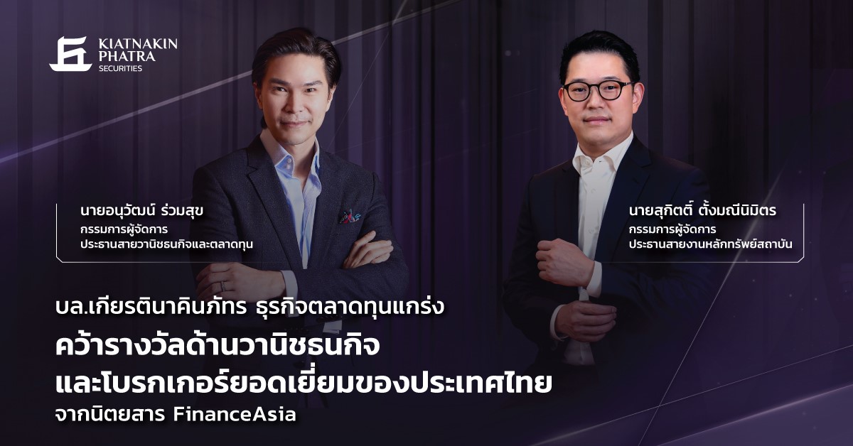 บริษัทหลักทรัพย์ เกียรตินาคินภัทร จำกัด (มหาชน) คว้า 2 รางวัลสำคัญในธุรกิจตลาดทุนไทย ได้แก่ รางวัลยอดเยี่ยมด้านวาณิชธนกิจในประเทศไทย (Best Investment Bank in Thailand) เป็นปีที่ 7 และรางวัลโบรกเกอร์ยอดเยี่ยมในประเทศไทย (Best Broker in Thailand) ต่อเนื่องปีที่ 7 จากงาน FinanceAsia’s Country Awards 2022 ที่จัดขึ้นโดย FinanceAsia นิตยสารการเงินชั้นนำแห่งเอเชีย โดยมี นายอนุวัฒน์ ร่วมสุข กรรมการผู้จัดการ ประธานสายวานิชธนกิจและตลาดทุน และ นายสุกิตติ์ ตั้งมณีนิมิตร กรรมการผู้จัดการ ประธานสายงานหลักทรัพย์สถาบัน เป็นผู้แทนกลุ่มธุรกิจฯ ประกาศความสำเร็จ ทั้งนี้ การให้รางวัลพิจารณาจากผลการดำเนินงานที่โดดเด่น ความเชี่ยวชาญในการดำเนินธุรกรรม ตลอดจนการมีส่วนส่งเสริมพัฒนาการของอุตสาหกรรมการเงินของประเทศไทย ท่ามกลางความท้าทายจากปัจจัยต่างๆ ที่ส่งผลกระทบต่อตลาดทุน โดยการประกาศผลรางวัลมีขึ้นเมื่อเร็วๆ นี้