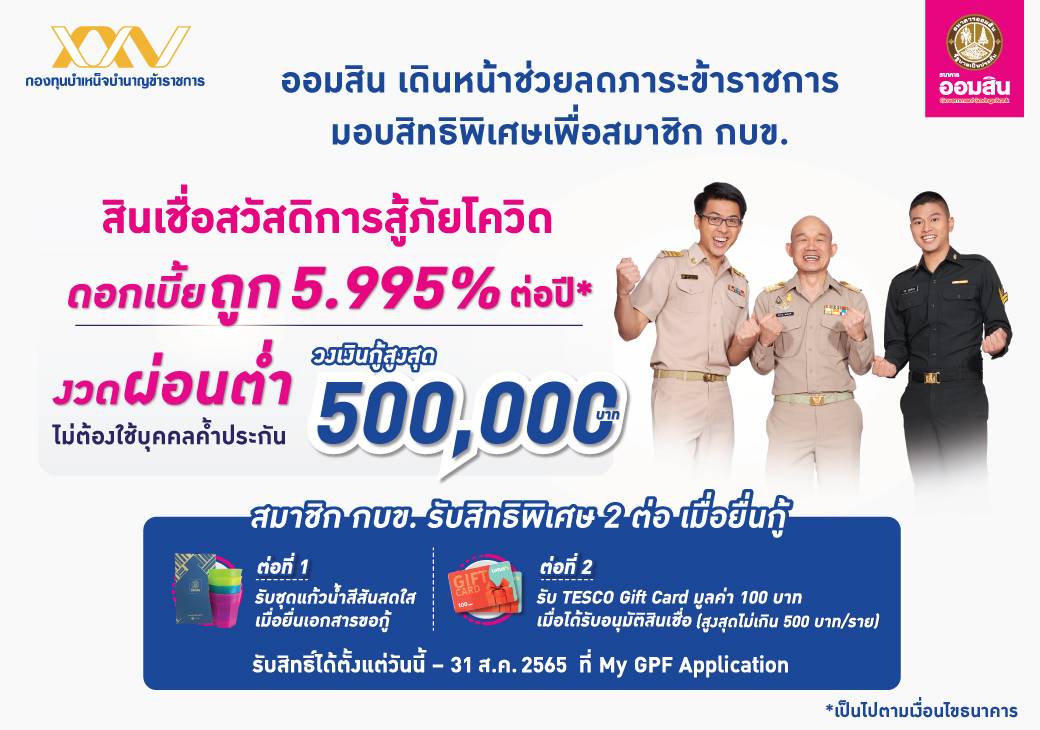 นายวิทัย รัตนากร ผู้อำนวยการธนาคารออมสิน เปิดเผยว่า ธนาคารออมสินได้จัดทำโครงการสินเชื่อผ่อนปรนหลักเกณฑ์การพิจารณาอนุมัติ พร้อมให้เงื่อนไขพิเศษในการกู้ เพื่อช่วยเพิ่มสภาพคล่อง บรรเทาความเดือดร้อนของประชาชนมาอย่างต่อเนื่อง หลากหลายโครงการ ครอบคลุมอาชีพต่าง ๆ ทั้งที่เป็นแรงงานในระบบ ผู้ประกอบอาชีพอิสระ ผู้ประกอบการรายย่อย รวมถึงข้าราชการ หรือบุคลากรของรัฐ ที่ปัจจุบันกลุ่มอาชีพบุคลากรของรัฐสามารถยื่นขอกู้ในโครงการ สินเชื่อสวัสดิการ “สู้ภัยโควิด” ที่มอบสิทธิประโยชน์พิเศษ คือ อัตราดอกเบี้ยต่ำสุด 5.995% (ตามเงื่อนไขธนาคาร) ไม่ต้องมีบุคคลค้ำประกัน ผ่อนชำระเงินงวดเพียง 1,200 บาทต่อวงเงินกู้ 100,000 บาท ให้กู้สูงสุดไม่เกินรายละ 500,000 บาท ซึ่งผู้กู้สามารถนำเงินกู้จากสินเชื่อสวัสดิการ “สู้ภัยโควิด” ไปชำระหนี้สินอื่นที่คิดดอกเบี้ยสูงกว่า ซึ่งจะช่วยเพิ่มสภาพคล่องในการใช้จ่ายอุปโภคบริโภคที่จำเป็นในชีวิตประจำวันได้ ดังนั้น เพื่อขยายผลให้ข้าราชการได้เข้าถึงสิทธิประโยชน์ของโครงการดังกล่าว ธนาคารจึงร่วมกับกองทุนบำเหน็จบำนาญข้าราชการ (กบข.) จัดโปรโมชันสำหรับสมาชิก กบข. มอบสิทธิพิเศษ 2 ต่อเป็นของที่ระลึกและบัตรของขวัญ ทั้งนี้ เฉพาะสำหรับสมาชิก กบข. ที่หน่วยงานต้นสังกัดได้ทำบันทึกข้อตกลงการให้สินเชื่อร่วมกับธนาคารออมสินไว้แล้ว