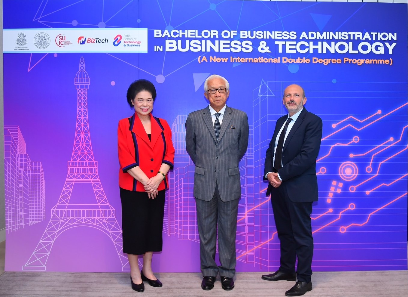 ผศ.ดร. สมพิศ ขัตติยพิกุล คณบดีวิทยาลัยนานาชาติ ม.ศิลปากร กล่าวเพิ่มเติมว่า ที่ผ่านมาวิทยาลัยนานาชาติ มหาวิทยาลัยศิลปากร ได้มีการเรียนการสอนหลักสูตรบริหารธุรกิจสาขาวิชาการจัดการโรงแรม และสาขาวิชาการจัดการสินค้าลักซ์ชัวรี่ และด้านการออกแบบสื่อสารดิจิทัล ที่ผลิตบัณฑิตป้อนสู่ภาคธุรกิจให้สามารถแข่งขันกับตลาดแรงงานมาตลอดระยะเวลาเกือบ 20 ปี สำหรับจุดแข็งที่สำคัญของการเรียนในหลักสูตรบริหารธุรกิจบัณฑิตสาขาวิชาธุรกิจและเทคโนโลยี (หลักสูตรนานาชาติ) นักศึกษาสามารถจบการศึกษาได้ภายใน 3 ปี และได้รับปริญญาตรี 2 ใบ จากวิทยาลัยนานาชาติ มหาวิทยาลัยศิลปากร และ Paris School of Technology and Business สาธารณรัฐฝรั่งเศส โดยจะได้รับความรู้ความเข้าใจทางด้านการจัดการธุรกิจและเทคโนโลยี หลักสูตรสอนเป็นภาษาอังกฤษ ซึ่งบัณฑิตที่สำเร็จการศึกษาในหลักสูตรนี้จะสามารถทำงานได้ทั้งภายในประเทศและนอกประเทศ และสามารถทำงานร่วมกับชาวต่างชาติได้ พร้อมกันนี้นักศึกษายังมีโอกาสในการเดินทางไปศึกษาแลกเปลี่ยนที่สาธารณรัฐฝรั่งเศสเป็นเวลา 1 เทอม ซึ่งนักศึกษาสามารถใช้สิ่งสนับสนุนการเรียนรู้จากสถาบันร่วมและยังเป็นการแลกเปลี่ยนเรียนรู้ด้านภาษาและวัฒนธรรม พร้อมยังเป็นการเพิ่มประสบการณ์ระดับนานาชาติให้แก่นักศึกษาในหลักสูตรอีกด้วย ซึ่งหลักสูตรนี้จะมาช่วยในการขับเคลื่อนและเพิ่มขีดความสามารถกับการพัฒนาเศรษฐกิจของประเทศไทย