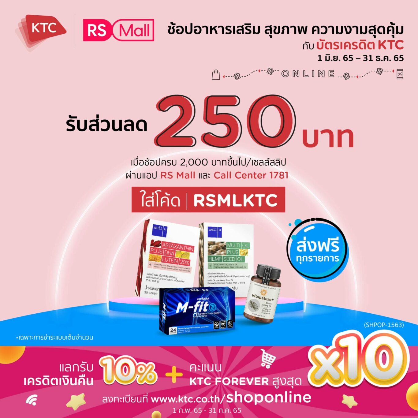 “เคทีซี” หรือ บริษัท บัตรกรุงไทย จำกัด (มหาชน) จับมือ “อาร์เอส มอลล์” (RS Mall) แพลตฟอร์มช้อปปิ้งออนไลน์ที่นำเสนอผลิตภัณฑ์อาหารเสริมเพื่อสุขภาพและความงาม ที่ได้รับการการันตีคุณภาพ โดยสินค้าทั้งหมดที่นำมาจำหน่าย ผ่านการรับรองมาตรฐานจากองค์การอาหารและยา (อย.) พร้อมส่งฟรีทุกรายการไม่มีขั้นต่ำ รับส่วนลด 250 บาท เมื่อช้อปสินค้าผ่านแอปฯ RS Mall และ Call Center 1781 ครบ 2,000 บาทขึ้นไป/ยอดซื้อ (เฉพาะการชำระแบบเต็มจำนวน) โดยระบุรหัสส่วนลด “RSMLKTC” ระหว่างวันที่ 1 มิถุนายน 2565 – 31 ธันวาคม 2565 รายละเอียดเพิ่มเติมhttps://ktc.today/RS-Mall พิเศษ แลกรับเครดิตเงินคืน 10% เมื่อใช้คะแนน KTC FOREVER เท่ากับยอดค่าใช้จ่ายออนไลน์ต่อรายการ และรับคะแนน KTC FOREVER สูงสุด x10 เท่า ลงทะเบียน www.ktc.co.th/shoponline ตั้งแต่วันที่ 1 กุมภาพันธ์ 2565 – 30 กันยายน 2565