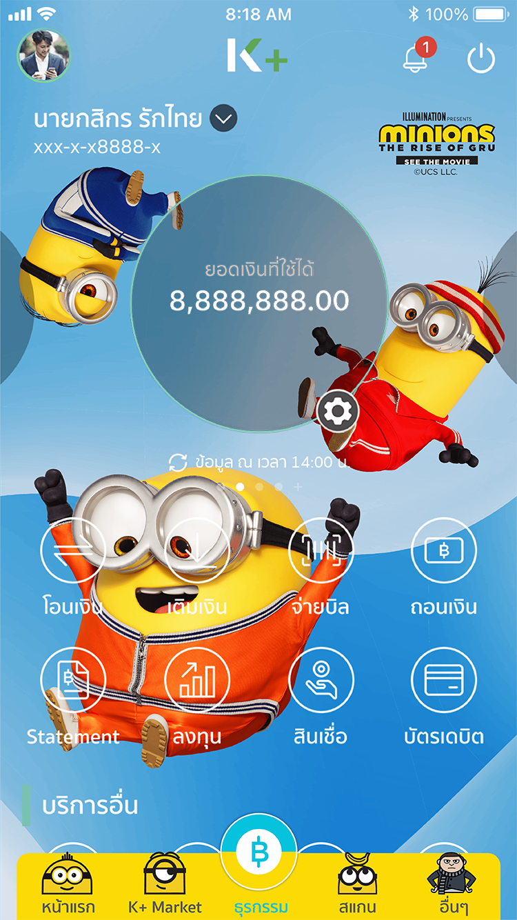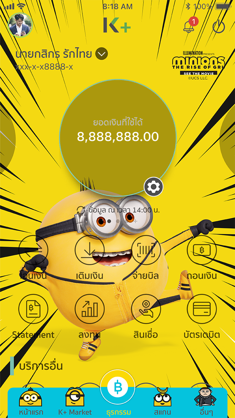 ธนาคารกสิกรไทย เอาใจแฟนๆ ภาพยนตร์ Minions: The Rise of Gru เปิดให้ดาวน์โหลดธีมมินเนี่ยนสุดน่ารักบน K PLUS ได้ฟรี มีให้เลือก 2 ลาย คือ ลาย Groovy (ธีมสีฟ้า) และลาย Manga (ธีมสีเหลือง) มาพร้อม e-Slip ลายพิเศษ ที่ช่วยเปลี่ยนให้การทำธุรธรรมผ่าน K PLUS สนุกสนานและมีสีสันมากขึ้น สามารถดาวน์โหลดได้ตั้งแต่วันนี้ – 31 ต.ค. 65