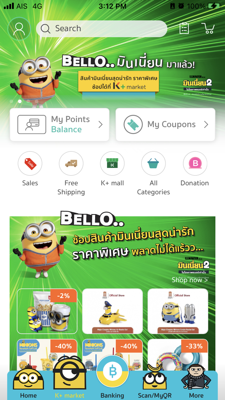 นอกจากนี้ ลูกค้า K PLUS ยังสามารถช้อปสินค้ามินเนี่ยน เช่น เซ็ตป๊อปคอร์น แก้วน้ำ เจลอาบน้ำ สเก็ตบอร์ด และอื่นๆ บน K+ market ได้ง่ายๆ จ่ายได้ทั้งเงินสดในบัญชี K PLUS หรือใช้คะแนนสะสม K Point แลกซื้อแทนเงินสด
