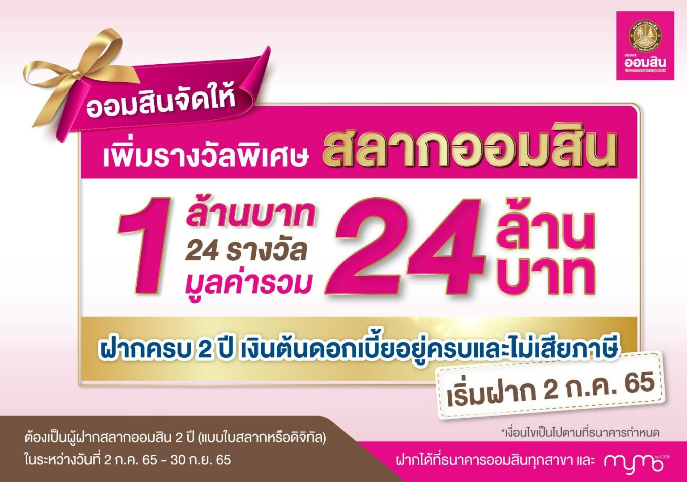 นายวิทัย รัตนากร ผู้อำนวยการธนาคารออมสิน เปิดเผยว่า ธนาคารออมสินเปิดรับฝากสลากออมสิน งวดใหม่ ทั้งสลากออมสินพิเศษ 2 ปี (แบบใบสลาก) และสลากออมสินดิจิทัล 2 ปี เพื่อส่งเสริมการออมและตอบรับกระแสเรียกร้องจากแฟนพันธุ์แท้สลากออมสิน พร้อมกับเพิ่มรางวัลพิเศษ รางวัลละ 1 ล้านบาท จำนวน 24 รางวัล รวมเป็นเงิน 24 ล้านบาท สำหรับผู้ที่ฝากสลากออมสินตั้งแต่วันที่ 2 กรกฎาคม ถึง 30 กันยายน 2565 ซึ่งกำหนดออกรางวัลพิเศษทุกวันที่ 1 ของเดือน รวม 3 ครั้ง โดยแบ่งการออกรางวัลในเดือนสิงหาคม 6 รางวัล กันยายน 8 รางวัล และ ตุลาคม อีก 10 รางวัล ตามลำดับ โดยผู้สนใจสามารถฝากได้ 2 ช่องทาง คือ ธนาคารออมสินทุกสาขาทั่วประเทศ และ ฝากผ่านแอป MyMo ซึ่งมีความสะดวกอย่างมาก