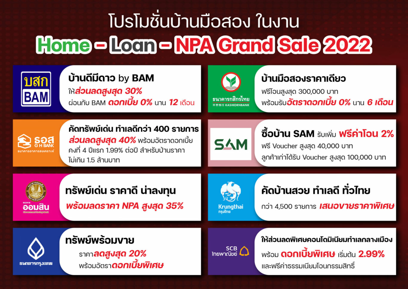 การจัดงานดังกล่าวจะมี NPA ของธนาคาร และสถาบันการเงินนับหมื่นรายการไม่ว่าจะเป็นบ้านเดี่ยว ทาวน์โฮม คอนโดมิเนียม อาคารพาณิชย์ อพาร์ตเมนต์ อาคารสำนักงาน โรงงาน และที่ดินเปล่า มาร่วมจัดกิจกรรมส่งเสริมการขายด้วยโปรโมชั่นต่างๆ และข้อเสนอสินเชื่อพิเศษ อาทิเช่น