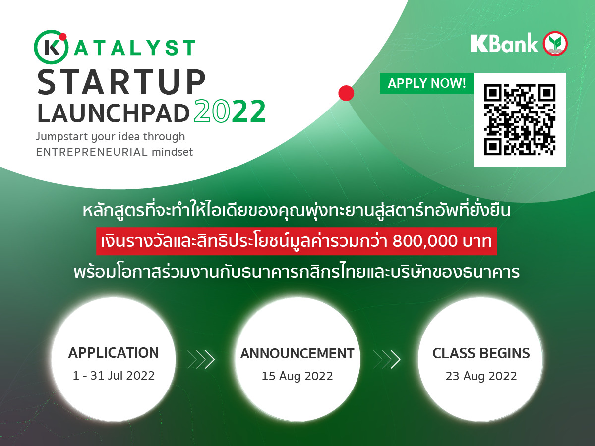 โครงการ KATALYST STARTUP LAUNCHPAD 2022 เป็นหนึ่งในกิจกรรมที่ธนาคารส่งมอบให้แก่สตาร์ทอัพ โดยความร่วมมือกับนักวิจัยจากมหาวิทยาลัยสแตนฟอร์ด สหรัฐอเมริกา ศาสตราจารย์ Charles (Chuck) Eesley มาช่วยสร้างหลักสูตรการอบรม อันเป็นส่วนหนึ่งของงานวิจัยด้าน Technology and Innovative Entrepreneurship และนำองค์ความรู้และเคล็ดลับความสำเร็จทางธุรกิจในระดับโลกมาถ่ายทอดให้สตาร์ทอัพไทยเพื่อสร้างพื้นฐานในการทำธุรกิจและนำไปประยุกต์ใช้ได้จริง โดยเปิดอบรมมาแล้ว 2 ปี ภายใต้การสนับสนุนของ The Stanford Thailand Research Consortium โดย KBank เป็นหนึ่งในสมาชิก