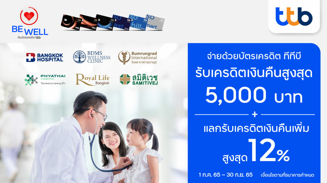 บัตรเครดิต ทีทีบี ร่วมกับ โรงพยาบาลชั้นนำที่ร่วมรายการ ได้แก่ โรงพยาบาลกรุงเทพและในเครือ BDMS Wellness Center และ Royal Life  โรงพยาบาลบำรุงราษฎร์  โรงพยาบาลพญาไทและในเครือ รวมทั้งโรงพยาบาลสมิติเวชและในเครือ จัดแคมเปญ “ยิ้มรับสุขภาพดี” มอบสิทธิพิเศษให้กับสมาชิกบัตรเครดิต ทีทีบี ที่มียอดใช้จ่ายแบบเต็มจำนวน ทั้งการใช้บริการ ณ โรงพยาบาลหรือการใช้บริการทางออนไลน์  ตั้งแต่วันที่ 1 กรกฎาคม – 30 กันยายน 2565