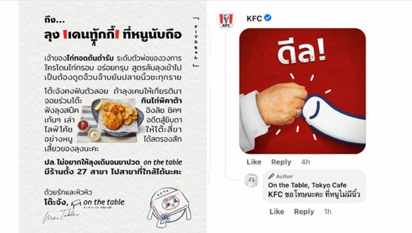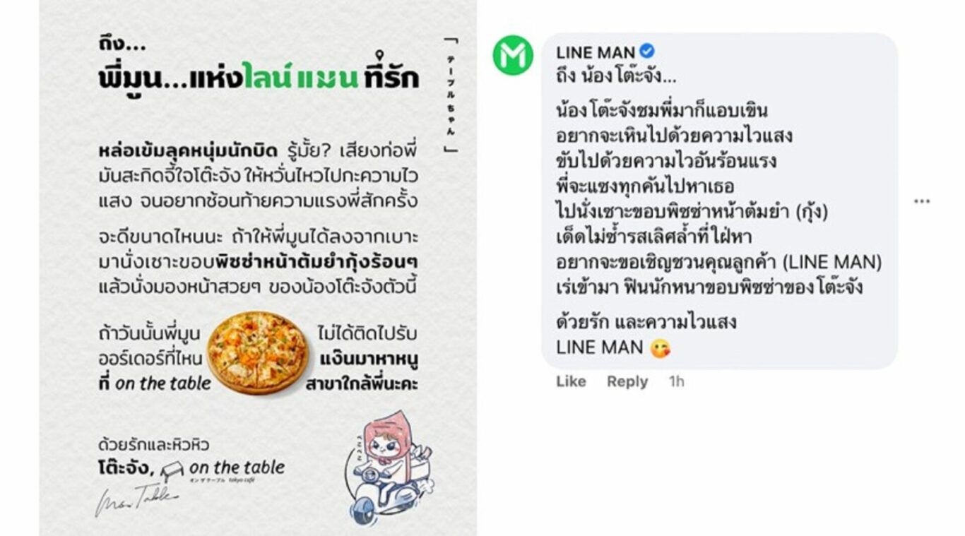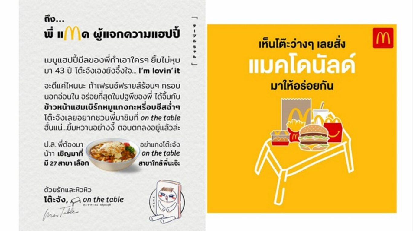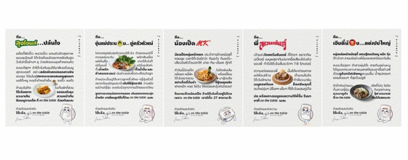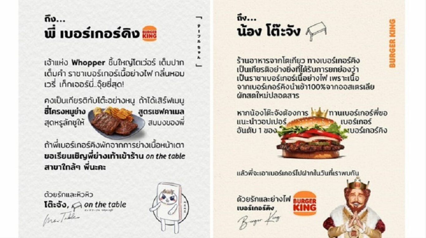 ร้านอาหาร On the Table สร้างกระแสหลังเปิดตัวแบรนด์มาสคอตน้องใหม่ ‘โต๊ะจัง’ ร่อนจดหมายหลายสิบฉบับส่งถึงร้านอาหารดังมากมายให้มาร่วมโต๊ะ ไม่ว่าจะเป็น Burger King, Dairy Queen, Swensen’s, KFC, LINE MAN, McDonald’s, แม่ประนอม, สุกี้ตี๋น้อย, MK และ Jones Salad