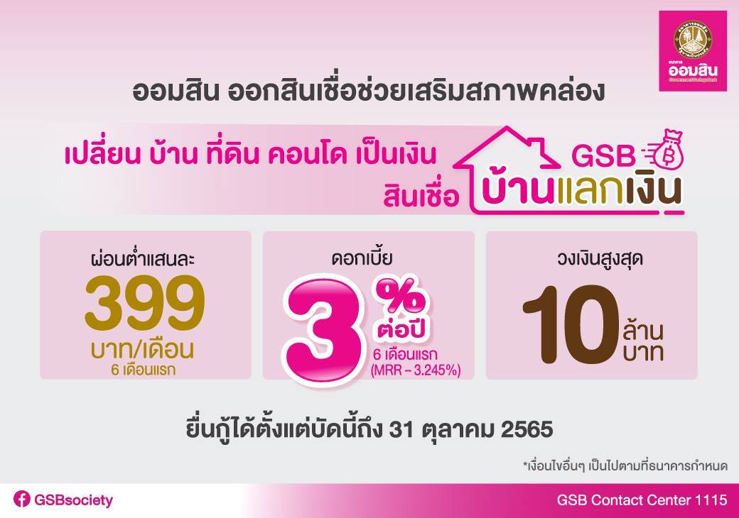 สินเชื่อ GSB บ้านแลกเงิน เป็นสินเชื่ออเนกประสงค์ที่เปิดกว้างสำหรับวัตถุประสงค์ในการขอกู้ ให้วงเงินกู้ไม่เกินรายละ 10 ล้านบาท สามารถใช้หลักทรัพย์ที่ปลอดจำนองมาเป็นหลักประกันได้ ทั้งที่ดินพร้อมสิ่งปลูกสร้าง / ห้องชุด (คอนโดมีเนียม) และที่ดิน ธนาคารให้กู้ไม่เกิน 90% /85% และ 60% ของราคาประเมิน ตามลำดับ คิดอัตราดอกเบี้ย 6 เดือนแรก อยู่ที่ 3.00% ต่อปี (MRR-3.245%) หรือคิดเป็นเงินงวดผ่อนต่ำใน 6 เดือนแรก เพียงแสนละ 399 บาทต่อเดือนเท่านั้น เดือนที่ 7-24 เท่ากับ MRR-1.955% (กรณีทำประกันชีวิตเพื่อคุ้มครองวงเงินสินเชื่อ) หรือ MRR-1.455% (กรณีไม่ทำประกันชีวิตเพื่อคุ้มครองวงเงินสินเชื่อ) และ ปีที่ 3 เป็นต้นไป MRR-0.50% หรือคิดเป็นดอกเบี้ยเฉลี่ย 3 ปี ต่ำสุดที่ 4.560% (ปัจจุบัน MRR ธนาคารออมสิน = 6.245%)