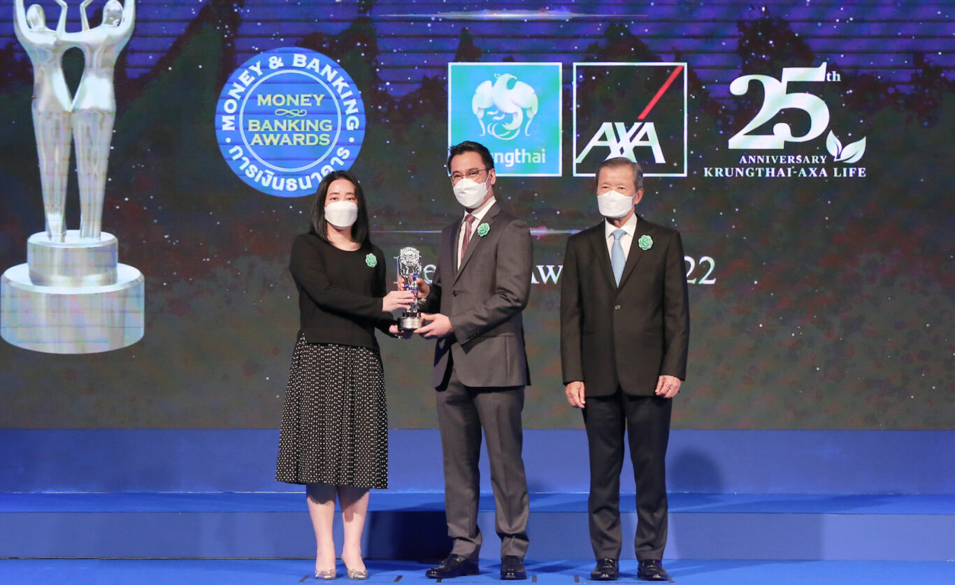 ดร. เศรษฐพุฒิ สุทธิวาทนฤพุฒิ ผู้ว่าการธนาคารแห่งประเทศไทย (กลาง) ประธานในพิธี และ นายสันติ วิริยะรังสฤษฎ์ ประธานบรรณาธิการ วารสารการเงินธนาคาร (ซ้าย) ให้เกียรติมอบรางวัลเกียรติยศ Money & Banking Awards 2022 โดยมี นางสาวสุกัญญา อิสรานุวัฒน์ชัย รองประธานอาวุโส ฝ่ายสื่อสารการตลาดและภาพลักษณ์องค์กร บมจ. กรุงไทย-แอกซ่า ประกันชีวิต (ขวา) รับรางวัล Great Design Awards บูธสวยงามประเภทพื้นที่ 210-225 ตารางเมตร จากงานมหกรรมการเงิน ครั้งที่ 22 Money Expo 2022 ซึ่งบริษัทฯ ได้รับรางวัลดังกล่าวต่อเนื่องเป็นปีที่ 2 โดยงานประกาศรางวัลจัดขึ้นเมื่อวันที่ 20 กรกฎาคม 2565 ณ ห้อง Fuji Grand Ballroom โรงแรม นิกโก้ กรุงเทพฯ
