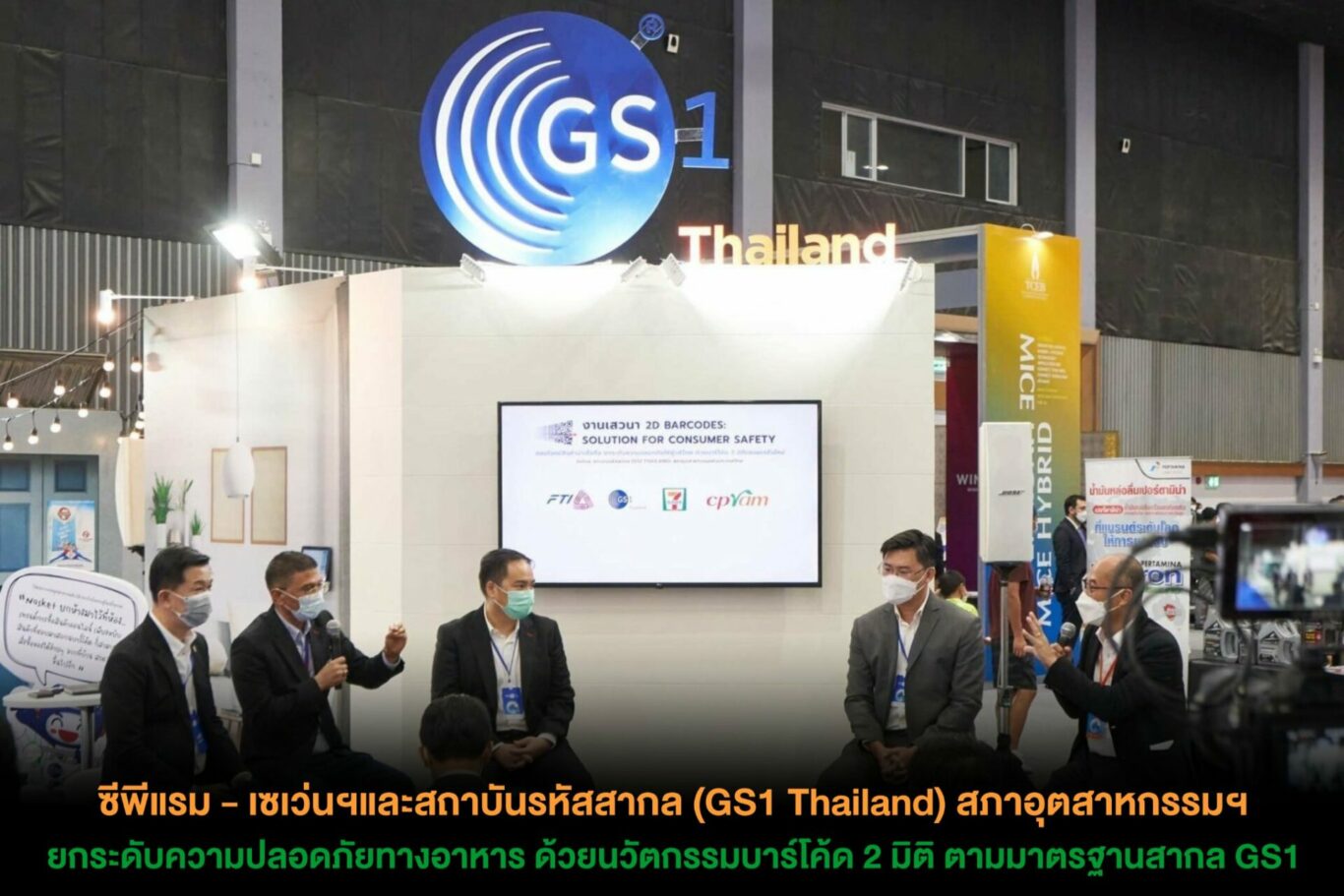 นายเจริญ แก้วสุกใส ประธานกลุ่มอุตสาหกรรมอาหาร สภาอุตสาหกรรมแห่งประเทศไทย และที่ปรึกษาอาวุโสคณะเจ้าหน้าที่บริหาร บริษัท ซีพีแรม จำกัด พร้อมด้วย นายณัฐสิทธิ์ อึ๊งภากรณ์ ผู้จัดการทั่วไป บริษัท ซีพีแรม จำกัด, ดร. คมสัน เหล่าศิลปเจริญ รองประธานสภาอุตสาหกรรมแห่งประเทศไทย และประธาน สถาบันรหัสสากล (GS1 Thailand) และ นายชาคริต เฮงสิริกุลHead of Unit, Research&Knowledge, Architecture&Design Group บริษัท โกซอฟท์ (ประเทศไทย) จำกัด บริษัทในกลุ่มซีพี ออลล์ ผู้บริหารเซเว่น อีเลฟเว่นและเซเว่น เดลิเวอรี่ ร่วมเสวนาในหัวข้อ “2D Barcodes: Solution for Consumer Safety” ตอบโจทย์สินค้าน่าเชื่อถือ ยกระดับความปลอดภัยให้ผู้บริโภค ด้วยบาร์โค้ด 2 มิติเจเนอเรชั่นใหม่ ณ บูธสถาบันรหัสสากล (GS1 Thailand) สภาอุตสาหกรรมแห่งประเทศไทย ภายในงาน FTI Expo 2022 ศูนย์ประชุมนานาชาติเฉลิมพระเกียรติ 7 รอบ พระชนมพรรษา จังหวัดเชียงใหม่